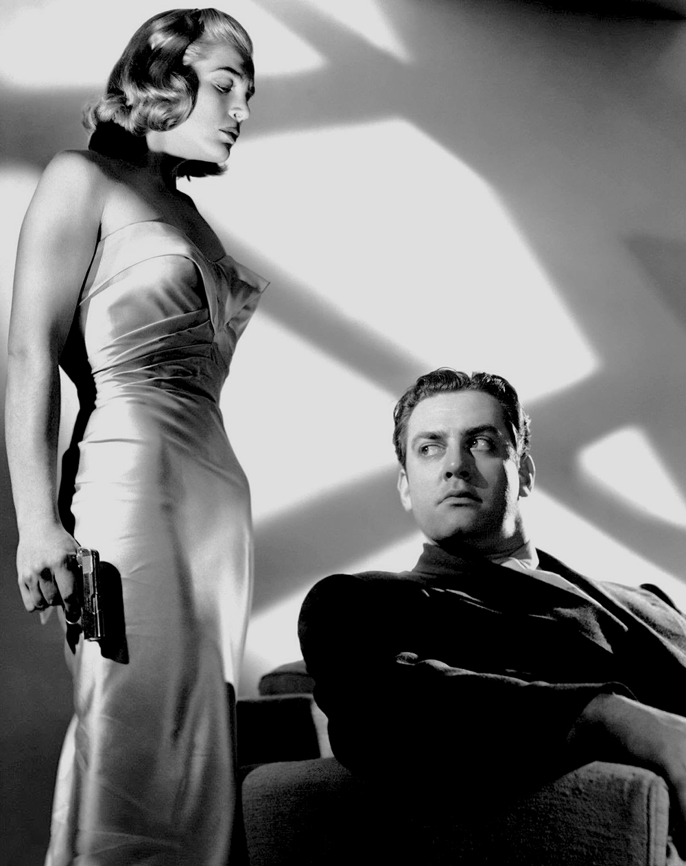 Malgré sa méfiance, le mâle se laisse prendre au piège de l’inexorable spirale de velours que la femme fatale sait, de ses longs doigts aux ongles carminés, enrouler autour de lui. Le plus parfait exemple de cette logique masochiste est sans aucun doute le roman de James Cain « Assurance sur la mort », publié en 1936. Elle, c’est Phyllis Nirdlinger ; lui, c’est Walter Huff, mais le public des salles obscures les connaît mieux sous les noms de Phyllis Dietrichson et de Walter Neff, cyniques meurtriers et escrocs à l’assurance du film de Billy Wilder Double Indemnity (Assurance sur la mort, 1944). Dans le rôle de Phyllis, Barbara Stanwyck réalisa la parfaite synthèse de l’héroïne du film noir à la fois distante et provocante. Signe révélateur de sa sensualité perverse : la fine chaîne qu’elle porte à la cheville et sur laquelle la caméra (qui adopte le point de vue de Neff-Fred MacMurray) s’attarde avant de montrer le visage de l’héroïne ; ce bijou lourd de symbole (il fut pendant longtemps la marque infamante de l’esclavage), propre à stimuler les plus puissants fantasmes érotiques, sera pour Neff le premier signe du destin.
