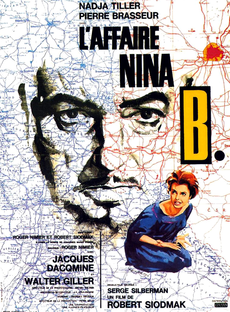 Séduit par ce sujet « délicat » et sans doute encouragé par le succès de librairie de Simmel, Robert Siodmak s’assure les droits du roman, s’installe à Paris et élabore personnellement l’adaptation. Les dialogues français sont rédigés par le jeune écrivain Roger Nimier (« Le Hussard bleu», «Les grandes personnes»). L’Affaire Nina B mobilise trois vedettes importantes : Nadja Tiller, son époux Walter Giller et Pierre Brasseur qui retrouve Siodmak après vingt-trois ans ; ils avaient tourné ensemble Quick, le sexe faible et Les Frères corses. La musique est confiée à une révélation de la « nouvelle vague », Georges Delerue. Mais pourquoi Siodmak travaille-t-il à Paris ? Voici donc un roman allemand, se déroulant entièrement en Allemagne, filmé et interprété (en français) par des Allemands et que produit une firme française dans les studios du Bois de Boulogne. «Il y a trois raisons à ce phénomène paradoxal, explique Siodmak, un film de cette catégorie de prix (2,5 millions) ne peut difficilement être amorti qu’en R.F.A., d’autant plus que les avances sur recette de l’Etat sont inexistantes dans ce pays. Il est plus simple de trouver des financiers coopératifs en France ; enfin, un film français se vend mieux sur le marché international qu’une production allemande devenue synonyme de médiocrité !»