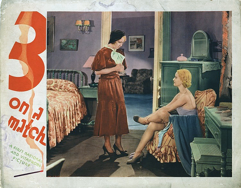 Three on a match est l’une des œuvres les plus saisissantes de la période du Pré-Code, autant par son intrigue, qui met en scène une mère bourgeoise plongeant dans les abysses de la pègre et de la drogue, et y sacrifiant son mariage et son fils, que par l’inventivité avec laquelle Mervyn LeRoy exprime le thème profond de son film : le passage du temps. Pour cela, tel les peintres contemporain se livrant à des collages, il mobilise les accessoires de la modernité, comme des manchettes de journaux, des illustrations, des publicités, afin de scander les années durant lesquelles les trois héroïnes, chacune de leur côté, mûrissent, en relation avec l’époque. Autrement dit, le destin des personnages de Mervyn LeRoy n’est en rien séparable du moment historique en lequel il se manifeste : tout le film doit être vu à l’aune de cette conception intense et profonde de l’existence humaine.