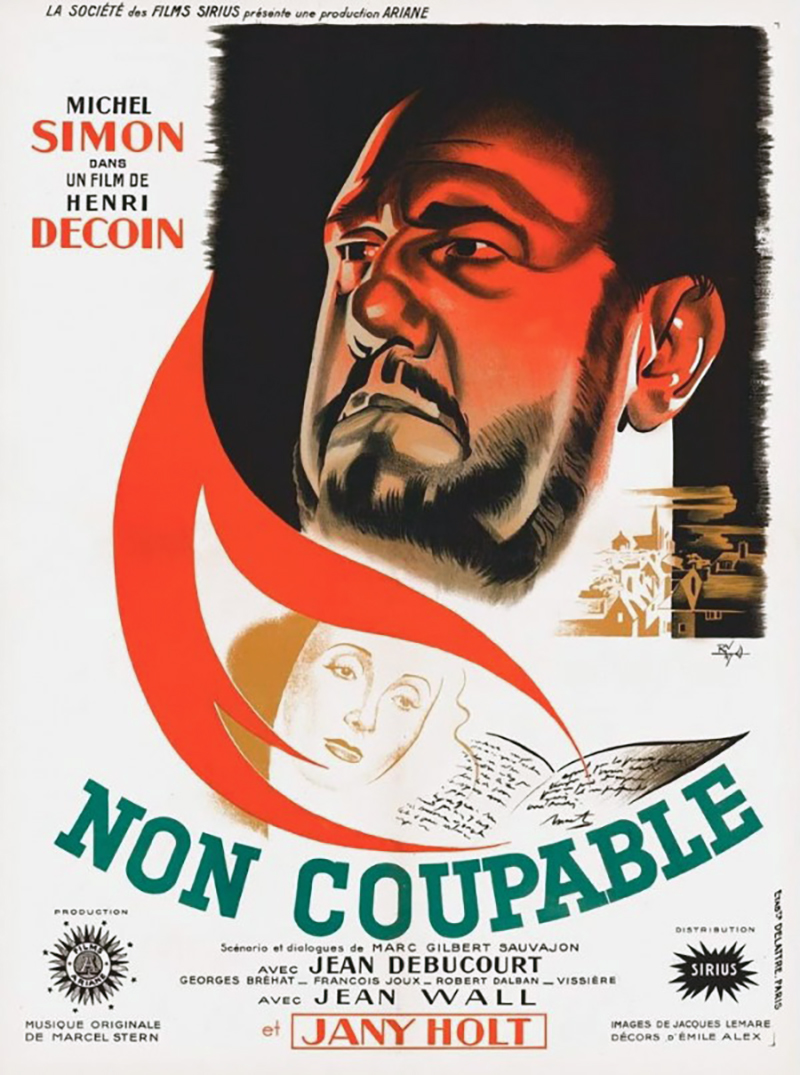 – Bien forcé, hélas ! C’est une maladie d’époque. Pour mon compte personnel, j’avoue que je préfèrerais autre chose. Il paraît que la clientèle aime cela ! Néanmoins, je me défends d’avoir fait un film noir. Ce n’est pas tout à fait cela. D’ailleurs, j’espère pouvoir faire changer le titre. Je voudrais qu’on appelle le film : Tu ne tueras pas ! ou Le Crime ne paye pas. Car en fait, c’est cela ». Decoin est bien injuste avec lui-même et avec le scénario, signé Marc-Gilbert Sauvajon. Surtout, il se fourvoie dans ses intentions, même si le résultat final est, lui, dans le bon tempo : Non coupable n’est pas un film moralisateur, sans être pour autant une comédie policière. C’est une farce un peu lourde, aux grotesques appuyés, mais qui tient parce que son interprète principal, Michel Simon, a les airs de gargouille nécessaires, l’orgueil et la déchéance mêlés en exactes proportions, tout comme l’intelligence et l’imbécillité.