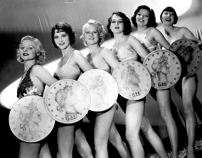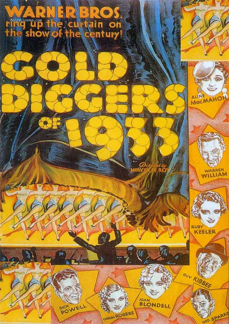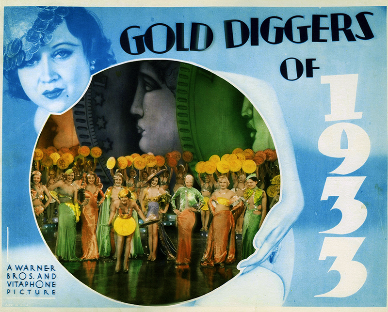 En 1933, première année de la présidence de Roosevelt, près d’un Américain sur quatre est chômeur et Gold Diggers of 1933 (Chercheuses d’or 1933) va témoigner, avec encore plus de force que 42nd Street, à la fois du génie de Busby Berkeley et de l’engagement du film musical de la Warner dans une représentation réaliste de l’Amérique de l’époque. Mervyn LeRoy qui, malade, n’avait pas pu tourner 42nd Street,, met en scène Gold Diggers of 1933 avec son efficacité habituelle, dirigeant brillamment ses interprètes dans une comédie à quiproquos parfaitement écrite. Le grand auteur du film demeure pourtant Busby Berkeley grâce à qui Gold Diggers of 1933 devient l’un des joyaux de la production musicale de la Warner.
