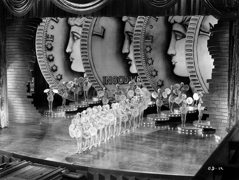 Chacun des quatre grands numéros du film lui permet d’expérimenter ses idées les plus folles tout en poursuivant ses thèmes – et ses obsessions – personnels. Dès le début, We’re in the Money décrit un univers placé sous le signe du tout-puissant dollar. De gigantesques pièces occupent la partie principale du décor et portent l’inscription « In God we Trust ». Les vêtements des girls sont composés de pièces et c’est d’un gigantesque dollar qu’apparaît la vedette du show. Alors même que Roosevelt incite au travail, au respect des autres et à la solidarité, We’re in the Money rappelle – comme la fête du veau d’or – la folie de ceux qui ne pensent qu’à s’enrichir.