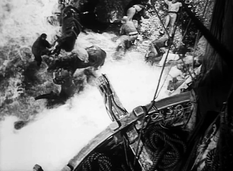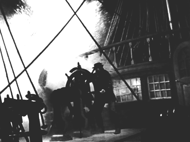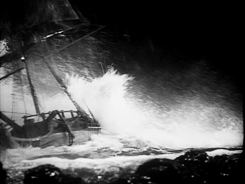 Fuite par la mer – Jem et Mary se sont réfugiés en canot dans une grotte creusée dans la falaise au bord de la mer. Tentant de fuir celui qu’elle prend pour un des pirates, Mary provoque la perte de l’embarcation. La bande de pillards, toujours à leurs trousses, les découvre dans leur cachette. Mary et Jem n’ont d’autre solution que de fuir à la nage.