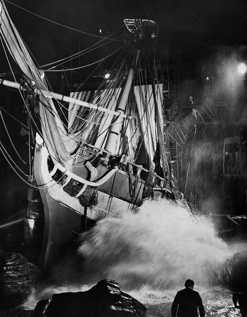 Jamaica Inn nécessita en effet des moyens dignes des grandes productions hollywoodiennes. Les immenses studios d’Elstree furent largement investis par d’imposants décors : paysages de Cornouailles peints et vue du port reconstitué, sans compter les deux demeures clés du film. Plus encore, l’équipe de tournage dut installer d’énormes bassins dans lesquels furent tournées les scènes maritimes. Les naufrages furent réalisés en studio, un bout de coque de bateau posé dans un bassin créant l’illusion du navire échoué, pendant qu’un système complexe agitait l’eau, créait les vagues et faisait voler l’écume. Toutes ces scènes devaient être montées avec des vues de la côte réelle ou, à l’inverse, des plans de maquettes de bateau à la dérive.