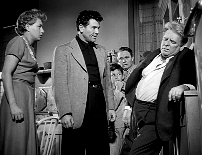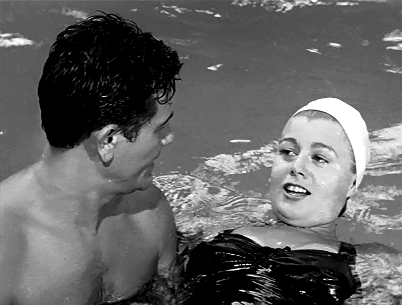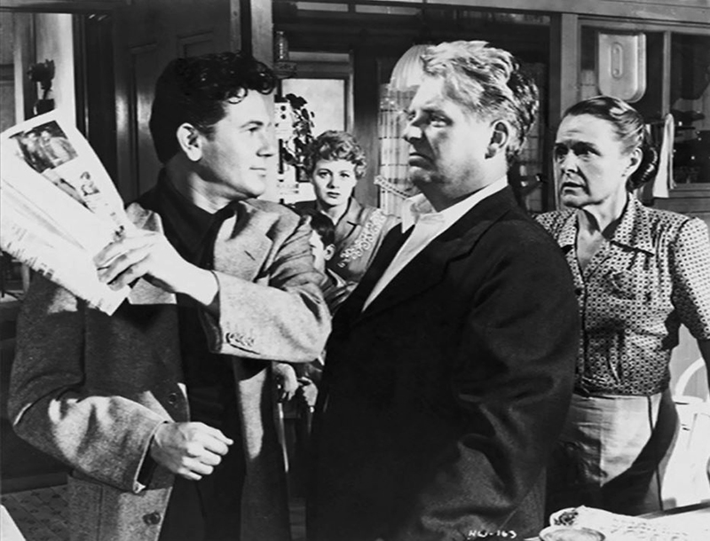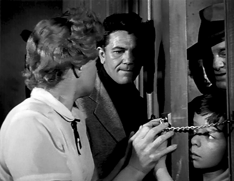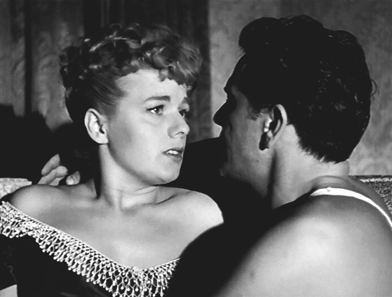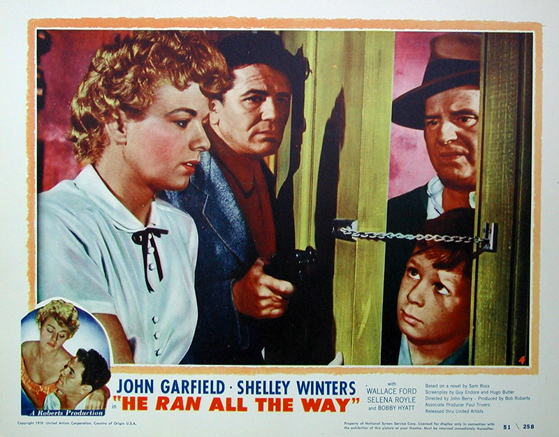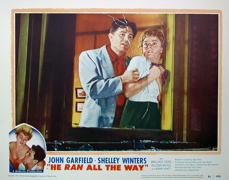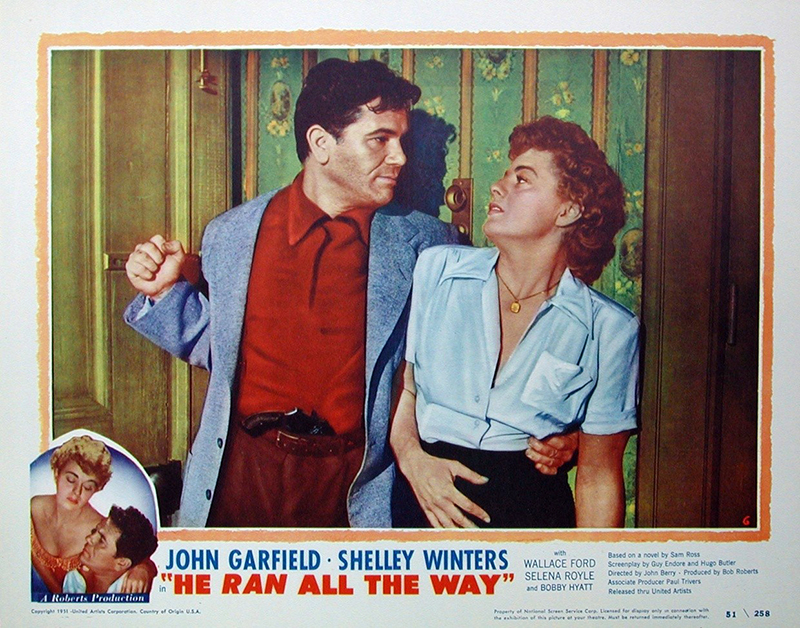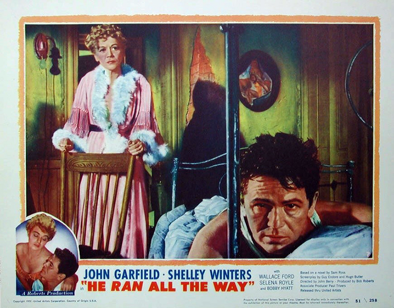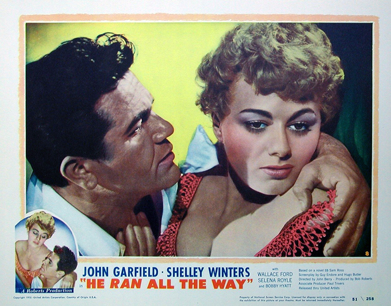La véritable pièce rapportée dans He Ran all the Way est Shelley Winters, même si, comme Garfield, elle est juive, et a grandi à Brooklyn. Sauf qu’à l’époque de He Ran all the Way, celle qui va incarner Peggy Dobbs, à la fois proie et bourreau de John Garfield, n’est pas encore la comédienne de The Night of the hunter (La Nuit du chasseur, Charles Laughton, 1955), qui remportera un Oscar pour The Diary of Anne Frank (Le Journal d’Anne Frank, George Stevens, 1959). Elle est cette belle plante, pas forcément bien identifiée à Hollywood, qui apparaît en général partout où il faut une blonde en décolleté. Dans Winchester 73 d’Anthony Mann (1950) par exemple, ou The Great Gatsby de Ted Nugent. Son rôle le plus significatif est dans A Place in the Sun (Une place au soleil, George Stevens, 1951) avec son air résigné quand Monty Clift est debout dans la barque et hésite à la noyer pour convoler en noces avec la riche héritière incarnée par Liz Taylor. Shelley Winters est alors cette femme qu’on a, au choix, envie d’écraser ou dont on rêve d’embrasser le décolleté. L’actrice passera alternativement sur le tournage de He Ran all the Way du statut de poupée Barbie à celui de tête à claques pour, au final, se révéler formidable. Elle a, également, signé la pétition en faveur des Dix de Hollywood et affiché, sans ambiguïté, même après 1951, le plus grand dédain pour les investigations menées par la Commission. La lecture de son autobiographie, Shelley II, permet de découvrir une actrice plus sophistiquée que les portraits faits d’elle, consciente du talent des metteurs en scène qui l’ont dirigée, de Charles Laughton à Stanley Kubrick, et d’être parvenue à s’extraire des emplois de starlette dans lesquels voulaient la cantonner les studios. Accepter le rôle de Peggy Dobbs dans He Ran all the Way et travailler avec Garfield et Berry s’inscrivait précisément dans cette volonté de s’affranchir de son image de mannequin. Sous contrat avec Universal, Winters avait donné son accord pour apparaître dans un péplum, Little Egypt, un refus de sa part aurait entraîné pour elle une suspension du studio. [Le Dernier film noir – Samuel Blumenfeld – Ed. Wild Side Video (2010)]