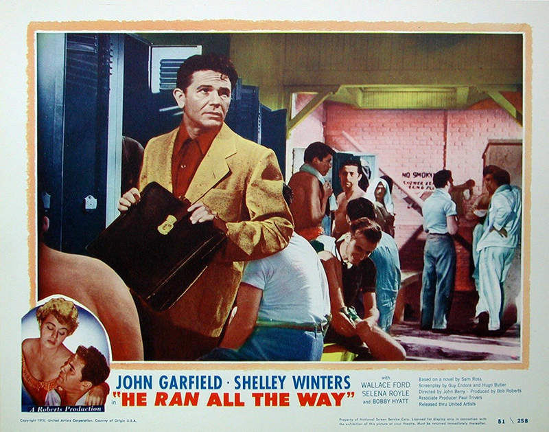 L’équipe de He Ran all the Way se révèle incroyablement homogène. Elle l’est d’abord sur un plan culturel – Garfield, Bob Roberts, et John Berry sont juifs, originaires du Bronx ou de Brooklyn – et politique. Guy Endore, John Berry, Bob Roberts, Dalton Trumbo et Paul Trivers, producteur associé du film, sont membres ou anciens membres du Parti Communiste américain. John Garfield, Norman Lloyd (AI, l’acolyte de Nick Robey dans le cambriolage), Selena Royle (citée, comme Garfield, dans la publication Red Channels, qui incarne Mme Dobbs) et Hugo Butler appartiennent à la frange libérale de Hollywood. Arnold Laven, futur réalisateur de cinéma et de télévision, qui officiait sur le film de John Berry au titre de « script supervisor », était particulièrement impressionné par la cohérence de cette équipe. « Ils étaient tous à gauche, Démocrates, du haut de la hiérarchie jusqu’en bas. Tous des gens formidables, je pense particulièrement à Hugo Butler. Je me rappelle que sur le tournage on m’avait demandé de signer une pétition. Quand j’avais demandé de quoi il s’agissait, on m’avait répondu que c’était pour telle ou telle croisade. J’ai répondu que je n’avais pas l’habitude de signer pour des trucs pareils. J’ai bien fait car signer m’aurait causé bien des problèmes plus tard. » [Le Dernier film noir – Samuel Blumenfeld – Ed. Wild Side Video (2010)]