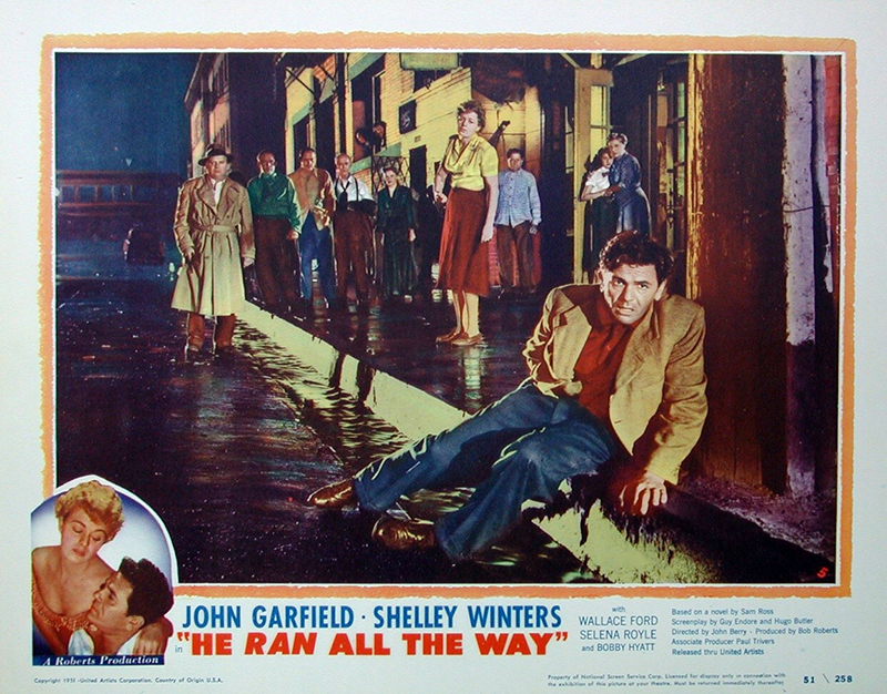 He Ran all the Way ne serait effectivement pas tout à fait le film qu’il est devenu sans le nœud coulant exercé par la Commission des activités anti-américaines sur les principaux protagonistes du film. Le sentiment d’inexorabilité entourant les personnages de He Ran all the Way ; cette idée d’un destin tragique dont ils comprennent progressivement la nature sans plus chercher à s’y opposer, reflétait à merveille l’état d’esprit de l’équipe du film, consciente, sans pouvoir encore le formuler distinctement, de voir le rideau se refermer sur elle. Entre le 6 décembre 1950, jour du début du tournage de He Ran all the Way, et sa première à New York le 20 juin 1951, le temps marque une accélération brutale. Durant la première vague d’auditions menées par la Commission, entre 1947 et 1951, qui culmine avec des condamnations de ceux qu’on baptisera les Dix de Hollywood – les scénaristes Dalton Trumbo, Alvah Bessie, Ring Lardner Jr., Lester Cole, Albert Maltz, Samuel Ornitz, John Howard Lawson ; les réalisateurs Edward Dmytryk et Herbert Biberman ; le producteur Adrian Scott – la résistance est encore possible, du moins dans les films réalisés par des cinéastes de gauche. On peut imaginer aussi qu’une fois ces fameux Dix livrés à la justice, la Commission suspendra ses investigations. Mais les ravages de la liste noire se font désormais autrement plus conséquents à partir de 1951, pour toucher Hollywood en profondeur, au-delà des seuls Dix de Hollywood. [Le Dernier film noir – Samuel Blumenfeld – Ed. Wild Side Video (2010)]