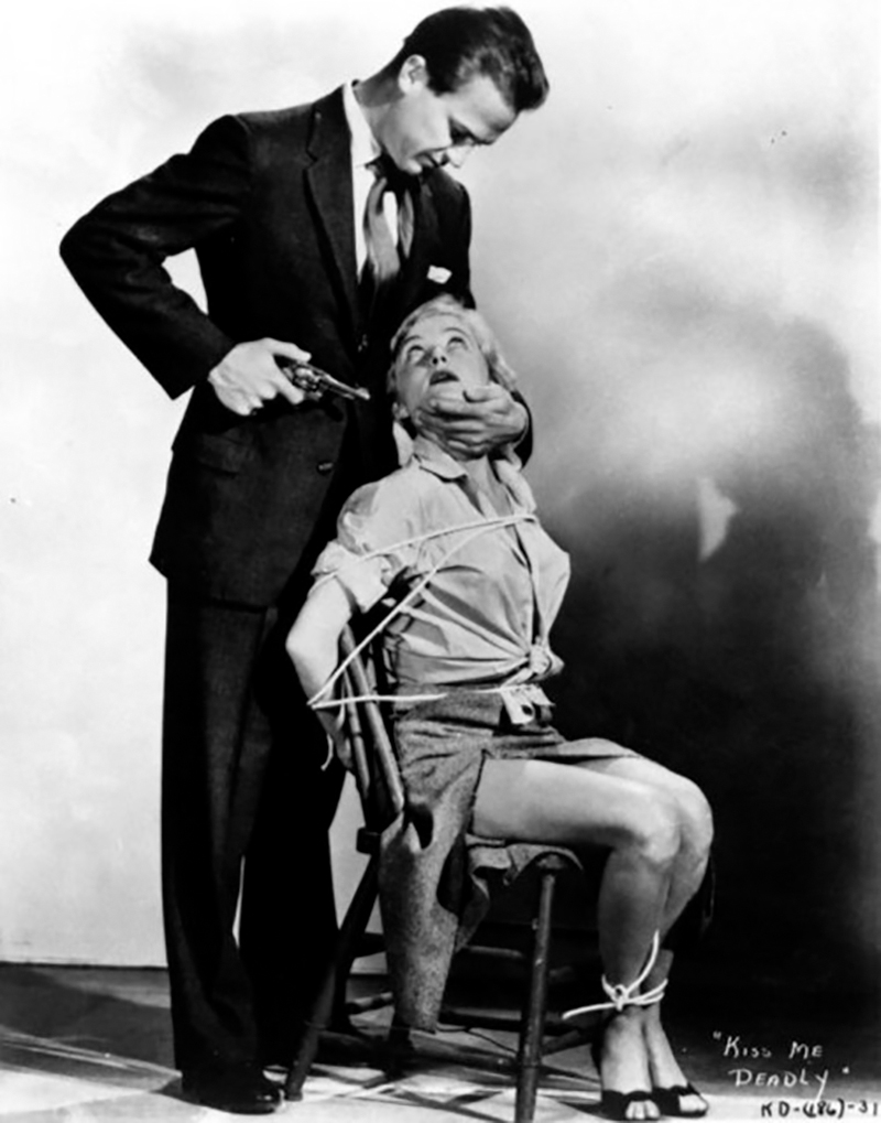Le début – Mike Hammer en voiture, une fille court sur l’autoroute nue sous son imperméable – précipite en quelques secondes le spectateur dans une intrigue qui ne se terminera que par l’explosion nucléaire, jalonnée de personnages bizarres et d’éclairs de violence – la vue de Christina pendue et torturée, Hammer écrasant la main du médecin de la morgue, Lily illuminée par l’incandescence de la « boîte diabolique ». On se souvient de Nick le garagiste et de ses « va-va-voom », de Fortunio Bonanova, du couple de tueurs formé par Jack Lambert et Jack Elam, deux inoubliables mauvais garçons du cinéma hollywoodien, et de ces femmes aimantes, pulpeuses ou destructrices, qui croisent la route de Mike Hammer. Volontairement. Aldrich choisit un son inexistant pour symboliser le bruit que l’on entend chaque fois que l’on ouvre la « boîte », un son qui est en réalité le mélange d’un moteur d’avion et des cordes vocales humaines de quelqu’un qui se trouve à bout de souffle. Le soin apporté à ces différents détails, l’utilisation de décors réels et la présence menaçante – dès les premiers plans – d’un monde nocturne sont à l’origine de l’impact du film, l’une des plus fascinantes descentes aux enfers décrites au cinéma.