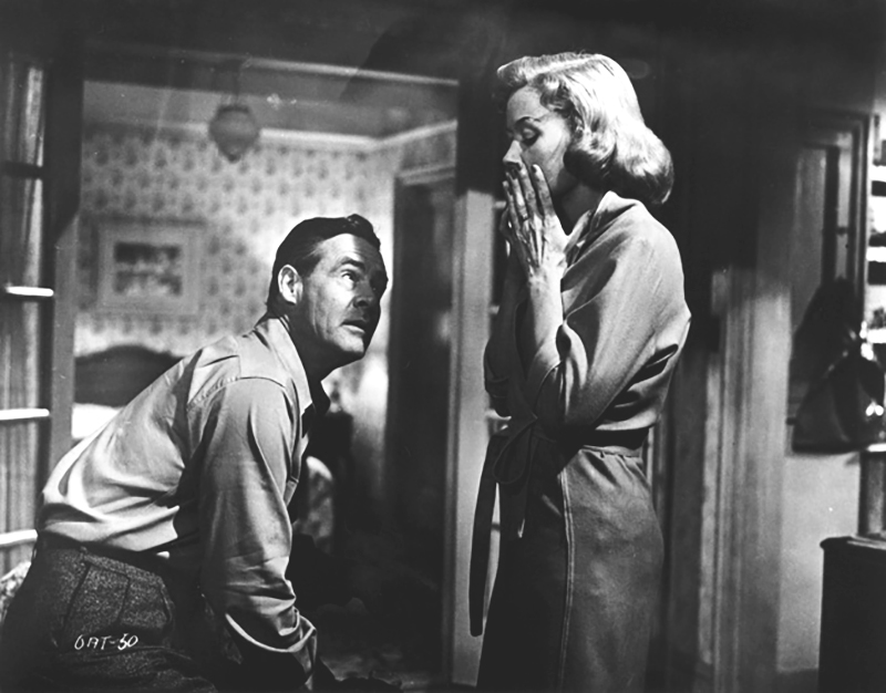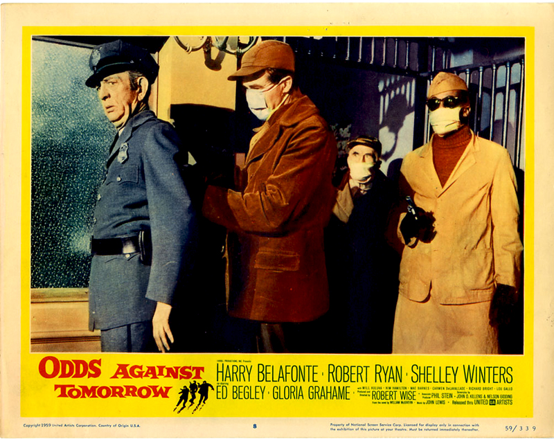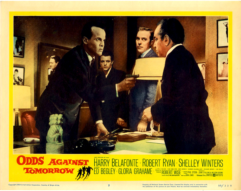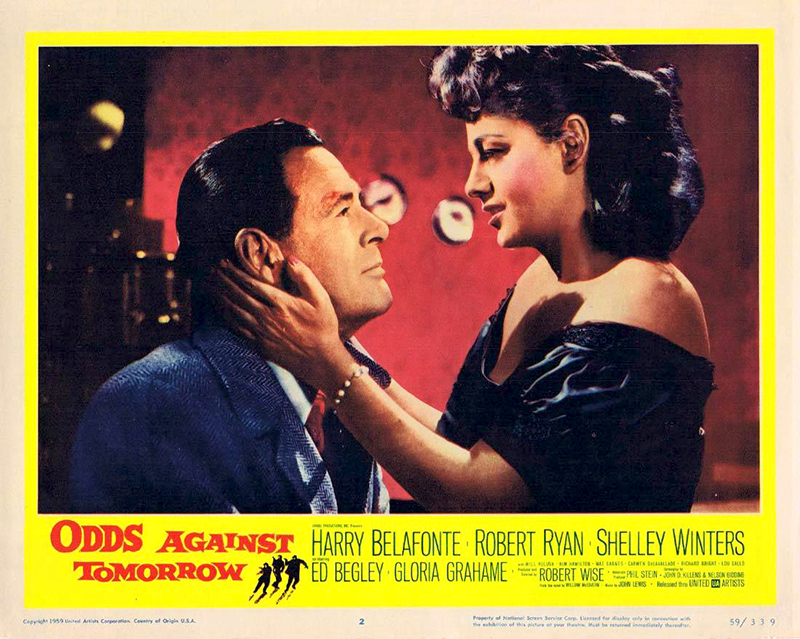 Odd against tomorrow pourrait être considéré visuellement parlant, comme le dernier film noir. C’est un estimable rejeton des comédies policières noires comme The Asphalt jungle (Quand la ville dort, John Huston, 1950), mis au goût du jour par un fond sonore « jazzy », les thèmes de l’homosexualité et du racisme. La fin rappelle l’apothéose de White Heat (L’enfer est à lui, 1949). Odd against tomorrow constitue en somme une bonne épitaphe au film noir car il fait référence à plusieurs sous-genres ayant défini son histoire (toutes les productions par exemple, qui mettent en scène des gangsters infâmes, des tueurs psychotiques, des conflits raciaux et autres problèmes sociaux). Le style noir de la fin des années 40 et du début des années 50 se retrouve dans Odd against tomorrow avec ses extérieurs noirs sur noirs et ses scènes d’intérieur efficaces situées dans des pièces sombres découpées par les diagonales des stores vénitiens. Gloria Grahame incarne la dernière veuve noire, ou femme fatale, typique du cycle : elle demande à Robert Ryan de l’exciter avant l’amour en lui racontant ce qu’il ressent au moment de tuer. [Encyclopédie du film Noir – Alain Silver et Elizabeth Ward – Ed Rivages (1979)]