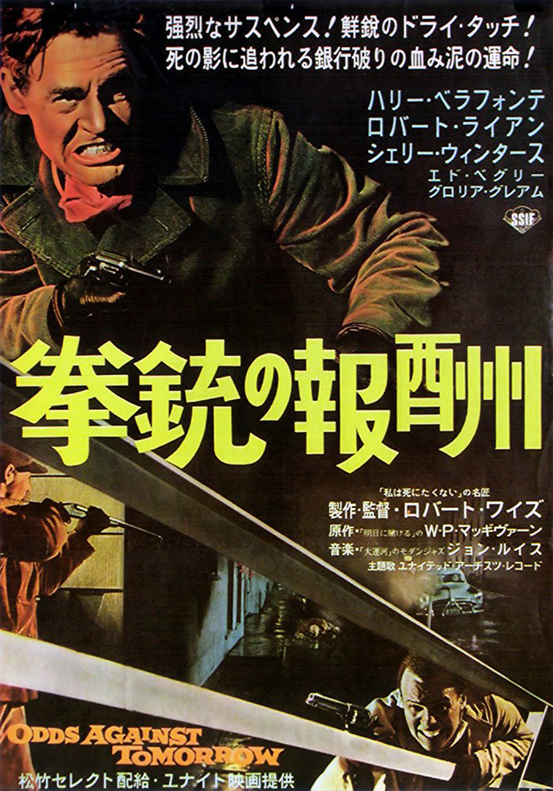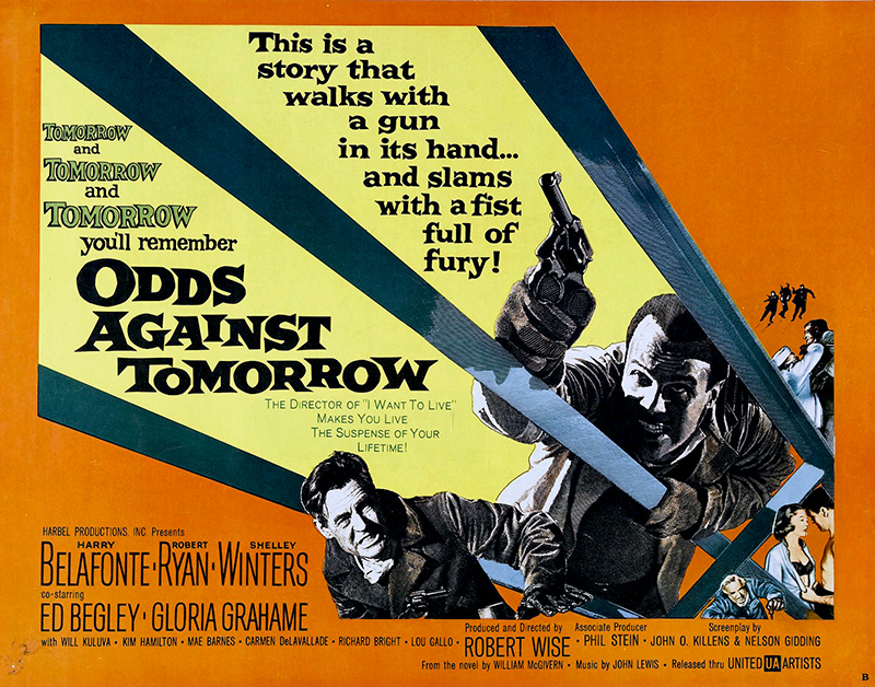 Un flic sexagénaire limogé pour corruption, un chanteur noir criblé de dettes de jeu et un vétéran de la seconde guerre qui n’a jamais réussi à se réintégrer s’associent pour un braquage de banque. la haine et le racisme font déraper l’entreprise… Adapté d’un roman de William Mac Given (The Big Heat) par Abraham Polonsky (Force of Evil) et Nelson Gidding et dans la lignée du Asphalt Jungle de John Huston, Odds Against Tomorrow s’intéresse plus à la psychologie des personnages qu’au « casse » proprement dit, qui, arrive à la fin, ne dure que quelques minutes et dont la conclusion reflète l’attitude suicidaire des protagonistes. Complexés, ambigus, ils sont le produit de l’univers glacial et étouffant dans lequel ils sont forcer d’évoluer. Ce film est le chant du cygne du film noir de la grande époque. [François Guérif]