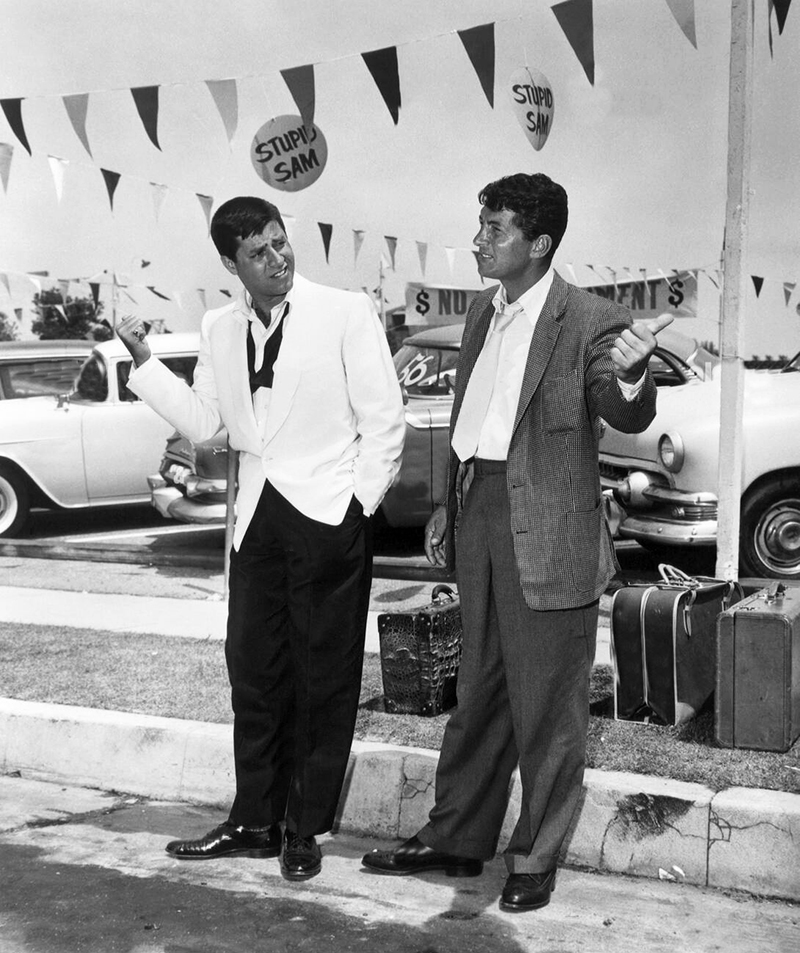 Né à Steubeville, dans l’Ohio, en 1917, Dino Crocetti, un Italo-Américain de la deuxième génération, fut tour à tour livreur de whisky de contrebande, barbier, boxeur et imitateur de Bing Crosby et de Tony Martin. Né en 1926 à Newark, dans le New Jersey, au sein d’une famille de comédiens, Joseph Levitch suivit ses parents, Rhea et Danny « Lewis », dans les tournées qu’ils effectuaient pour le circuit Borscht ; c’est ainsi qu’il chanta sur scène dès l’âge de cinq ans. Ouvreur de cinéma, puis mime, il mit au point un numéro de lip-synh (pantomime synchronisée sur un air célèbre) avec lequel il eut un grand succès. En 1946, à la suite d’un malentendu, Jerry Lewis et Dean Martin se retrouvèrent ensemble sur la scène du Club 500 d’Atlantic City. Le tour de chant du crooner, « agrémenté » par les facéties et les grimaces simiesques de l’affreux Jerry (il faisait gicler l’eau de Seltz, laissait tomber des assiettes, en souriant de toutes ses grandes dents), connut un triomphe immédiat si bien que toutes les boîtes de nuit américaines et les chaînes de télévision se disputèrent le nouveau tandem, et qu’un producteur de la Paramount, Hal Wallis, s’empressa de lui offrir un contrat de cinq ans à 10 000 dollars par semaine.