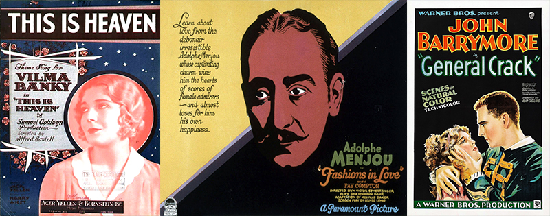 Nombre d’acteurs, loin de s’effrayer du micro, l’utilisèrent comme tremplin d’une nouvelle carrière. De gauche à droite : Vilma Banky sut jouer adroitement de son accent hongrois pour interpréter la jeune immigrée de This is Heaven ; Adolphe Menjou peaufina son personnage habituel de Français en adoptant l’accent parisien ; John Barrymore, sa voix contribua beaucoup au succès de General Crack