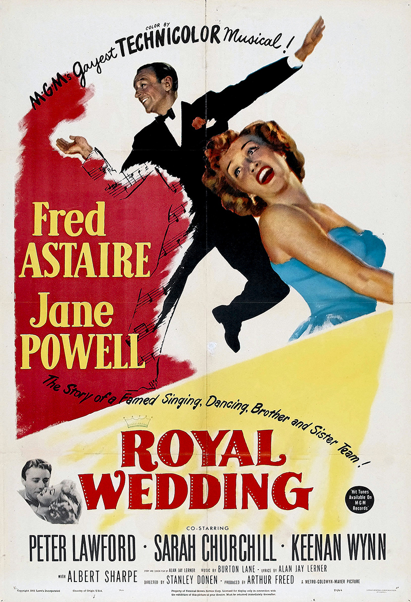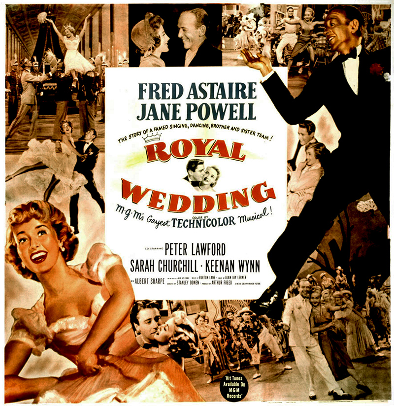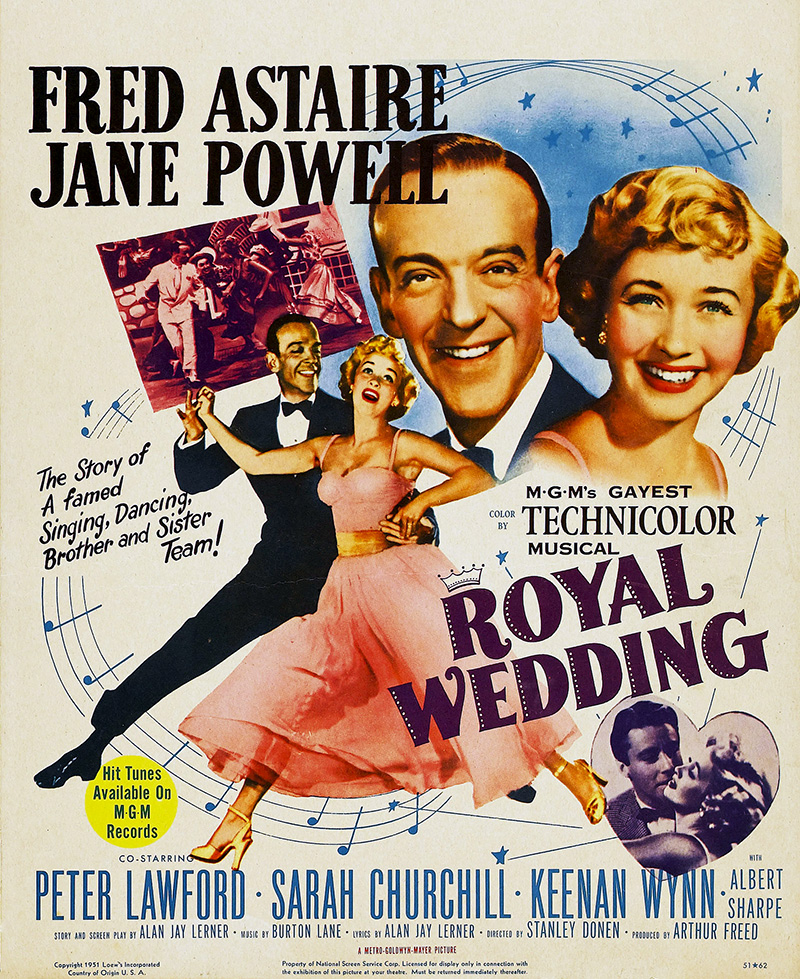 Certains génériques semblent dérouler le « Who’s who » de la comédie musicale. C’est le cas de Royal Wedding (Mariage royal), qui n’a pas seulement pour vedettes Fred Astaire et Jane Powell, mais bénéficie en outre du prestige de Stanley Donen, réalisateur de On the Town (Un Jour à New York) et de Singin’in the rain (Chantons sous la pluie) et d’Alan Jay Lerner, scénariste multi-oscarisé. Sans oublier le décorateur Cedric Gibbons et le producteur Arthur Freed, deux noms indissociables de l’âge d’or de la MGM.. Toutes ces bonnes fées se sont penchées sur le berceau de Royal Wedding, film qui n’égale sans doute pas d’autres chefs-d’œuvre signés par ces artistes, mais qui comporte certains des meilleurs numéros musicaux tournés à Hollywood. À commencer évidemment par celui qui suffit encore aujourd’hui à évoquer toute la magie de Fred Astaire, seul acteur capable de danser au plafond… Sorti en mars 1951, Royal Wedding est également important car il s’agit du premier film réalisé en solo par StanleyDonen, sans son complice Gene Kelly. Ce nouveau jalon permettra au cinéaste de poursuivre une carrière qui fera de lui l’un des grands spécialistes de la comédie musicale, avant de s’ouvrir tout aussi brillamment à d’autres genres.