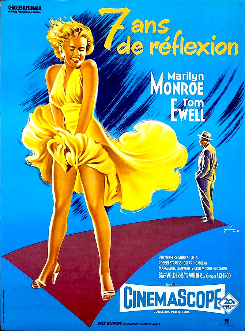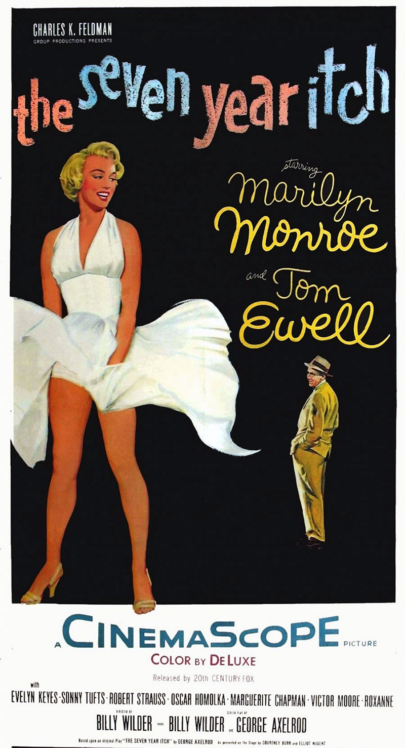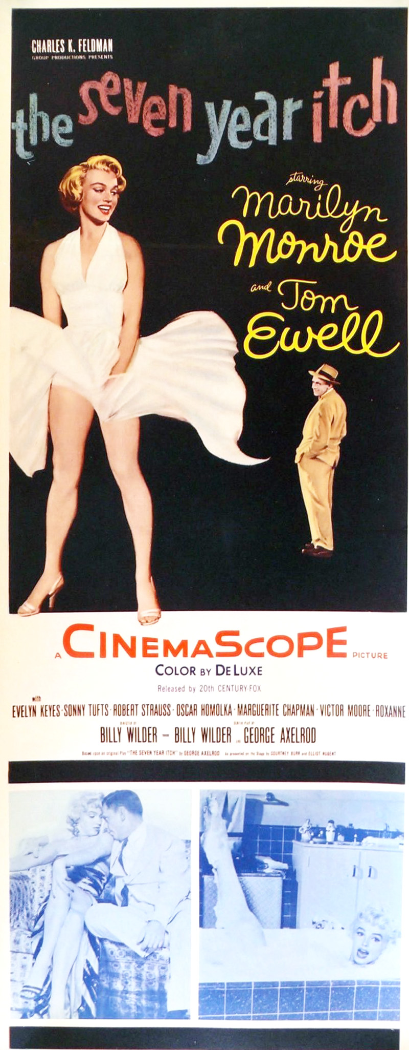 Wilder qui n’aimait pas ce film raconte la rencontre d’une jolie blonde et d’un homme marié resté seul en été à New York. Car la censure l’a empêché de montrer l’adultère et il n’a pas pu imposer le débutant Walter Matthau dans le rôle principal. Contraint de prendre le créateur de la pièce, Tom Ewell, qui donne une direction vaudevillesque à l’ensemble, c’est par des touches burlesques ou cyniques qu’il nourrit le film afin de dépasser les stéréotypes et les édulcorations du texte, introduisant subtilement des images mentales par superposition dans une partie de l’écran Cinémascope. Il réussit aussi à exprimer franchement les pulsions sexuelles de son personnage central grâce à la présence de Marilyn qui vampirise le film par sa sensualité animale. Des années plus tard, il montrera ce que The Seven year itch aurait pu être par quelques séquences explicites dans Kiss Me, Stupid (Embrasse-moi, idiot).
