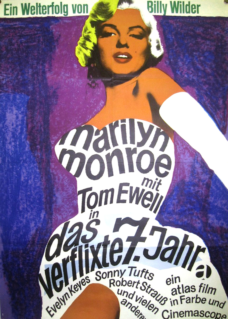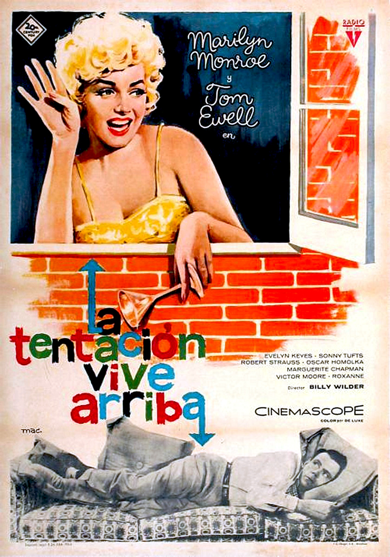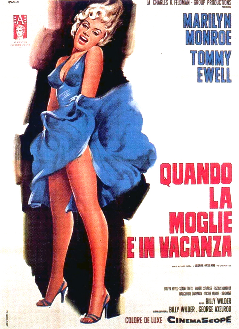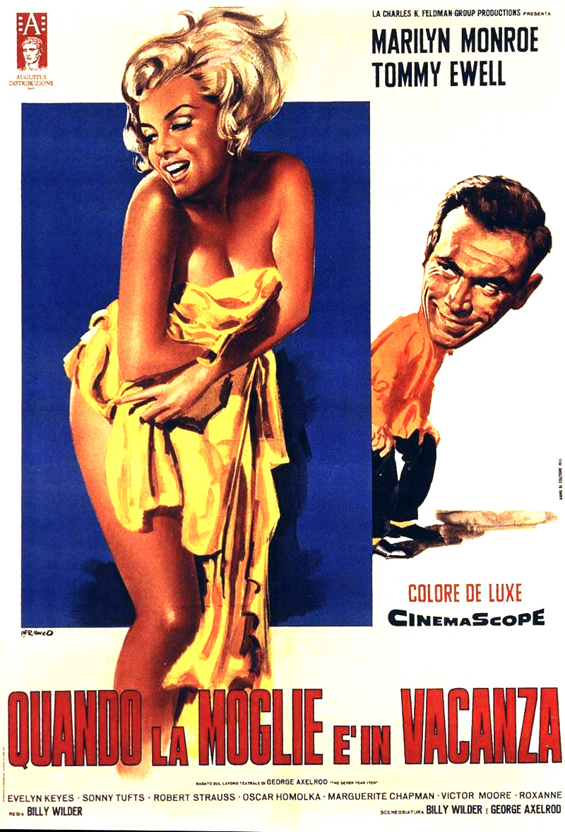 Wilder qui n’aimait pas ce film raconte la rencontre d’une jolie blonde et d’un homme marié resté seul en été à New York. Car la censure l’a empêché de montrer l’adultère et il n’a pas pu imposer le débutant Walter Matthau dans le rôle principal. Contraint de prendre le créateur de la pièce, Tom Ewell, qui donne une direction vaudevillesque à l’ensemble, c’est par des touches burlesques ou cyniques qu’il nourrit le film afin de dépasser les stéréotypes et les édulcorations du texte, introduisant subtilement des images mentales par superposition dans une partie de l’écran Cinémascope. Il réussit aussi à exprimer franchement les pulsions sexuelles de son personnage central grâce à la présence de Marilyn qui vampirise le film par sa sensualité animale. Des années plus tard, il montrera ce que The Seven year itch aurait pu être par quelques séquences explicites dans Kiss Me, Stupid (Embrasse-moi, idiot).