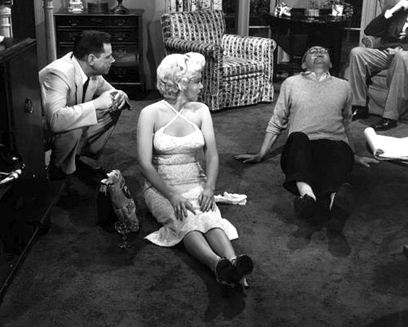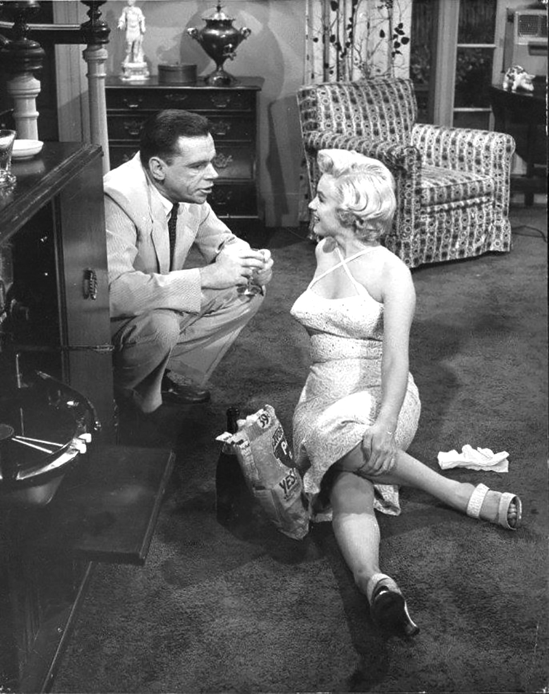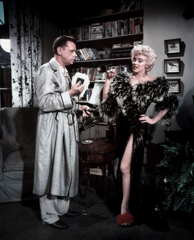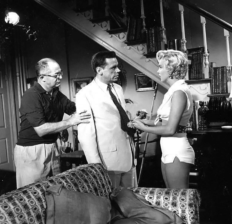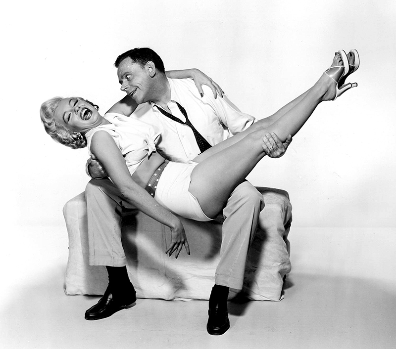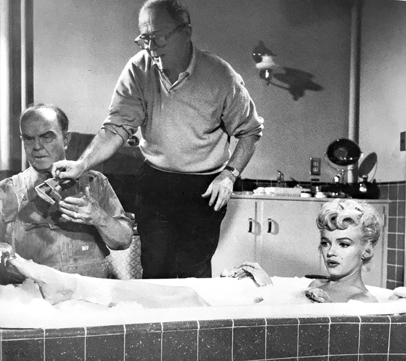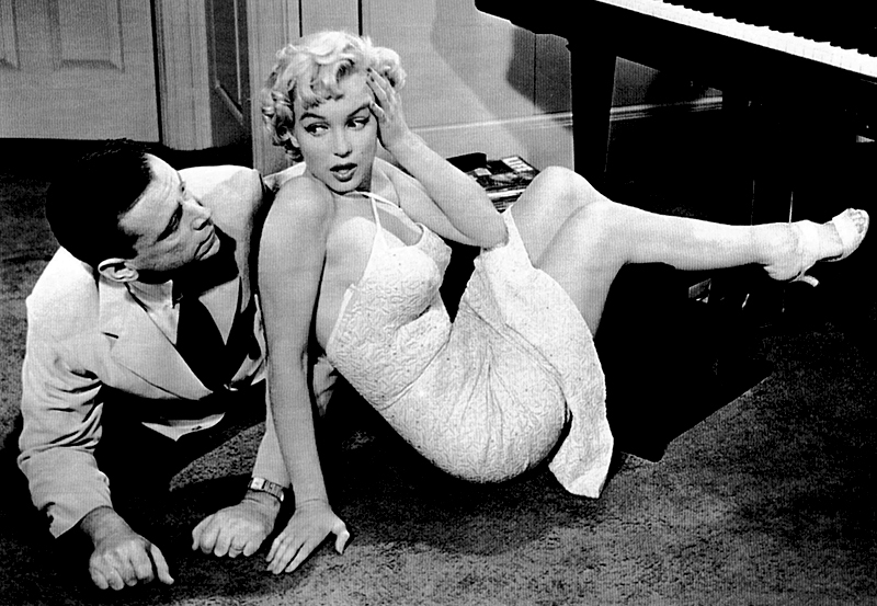 Puisque le champagne sied si bien à Billy Wilder, voici sans doute son film le plus pétillant, le plus délirant, avec Some like it hot (Certains l’aiment chaud), tourné quatre ans plus tard. Un feu d’artifice Marilyn ; rien ni personne ne lui résiste, pas plus qu’au petit chaperon rouge de Tex Avery, qui rendit dingue plus d’un loup ! L’évocation de Tex Avery, génie du cartoon, n’a d’ailleurs rien de fortuit, car Billy Wilder a bien des points en commun avec lui : les pieds-de-nez aux codes sociaux de morale tout comme ce perpétuel malin plaisir de la parodie, de la citation, du désamorçage en clin d’œil, comme ici les allusions au célèbre From Here to Eternity (Tant qu’il y aura des hommes) de Fred Zinnemann (lui aussi Viennois) ou la réplique de Tom Ewell désignant la « Fille » : « La fille dans la cuisine, c’est Marilyn Monroe ! » Et puis il y a, bien sûr, Creature from the Black Lagoon (L’Etrange créature du lac noir), film fantastique en relief de Jack Arnold, que vont voir Tom Ewell et Marilyn, celle-ci regrettant, à la sortie, que la créature en question n’emmène pas avec elle à la fin la jeune héroïne, Kay Lawrence/Julia Adams (regret anticipé que Tom Ewell s’en aille lui aussi à la fin ?). Ils font quelques pas, et c’est là qu’une bouche d’aération a la merveilleuse idée de faire voleter les plis de la jupe de Marilyn ! Image à jamais gravée au zénith du cinématographe, peut-être la plus célèbre de l’histoire du 7e Art !