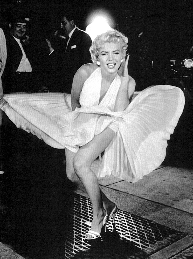 New York, Lexington Avenue, septembre 1954. Des barrières de police cernent le quartier : la Fox a fait en sorte que tout le monde sache que Marilyn Monroe apparaîtra à cet endroit même, vers 1 heure du matin, pour y tourner l’une des scènes de The Seven year itch. Environ cinq mille personnes sont là, admirateurs, fans, mais aussi ennemis de Marilyn… Plus une centaine de photographes cherchant tous à être au premier rang ! Marilyn frissonne de peur et de froid. Puis le plaisir de se montrer à ceux qui l’aiment, la régénère : c’est ainsi qu’elle parvient à tourner et à retourner la scène de la robe plissée se relevant sur la grille du métro, et se soulevant sous les effets du courant d’air de ce qui n’est en fait qu’un ventilateur. Son visage exulte de plaisir, mais certains psychanalystes ne verront là qu’un masque de douleur, une grimace façon comedia dell’arte