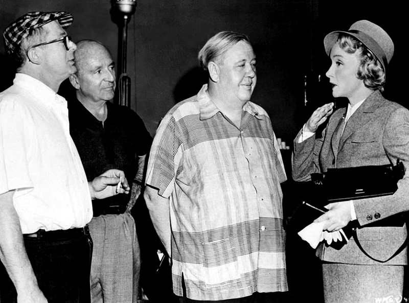 Billy-Wilder, Arthur-Hornblow, Charles-Laughton et Marlene-Dietrich sur le tournage de Witness Prosecution (Témoin à charge, 1957)