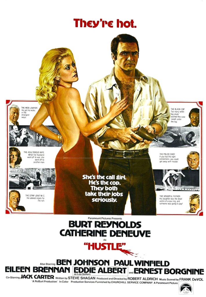 Hustle (La cité des dangers) est ainsi l’un des rares films d’Aldrich où l’histoire d’amour joue un rôle aussi essentiel. « Il me semblait dit Aldrich, que si la scène d’amour clef du film – celle dans le bar lorsque Catherine dit à Burt que s’il l’aime véritablement elle renoncera à son métier de prostituée et que lui répond qu’il ne pense pas en être capable – que si cette scène était écrite comme il le fallait – et je crois qu’elle l’est – nous aurions une relation amoureuse très intéressante. Je n’ai jamais pensé que le film pourrait marcher comme un film » d’aventure et d’action » car l’histoire policière est trop mince; il ne se passe pas grand-chose. Mais j’ai pensé que cela pourrait être une merveilleuse histoire d’amour à condition que la femme soit une étrangère. Dans le scénario, elle était américaine et cela m’embêtait beaucoup parce que bon nombre d’Américains trouveraient inacceptable qu’un homme envisage sérieusement une relation amoureuse permanente avec une prostituée. Il me semblait que le problème serait grandement atténué si celle-ci était une étrangère. C’est une décision que j’avais prise avant même d’offrir le rôle à Deneuve et elle fut notre premier choix. »
