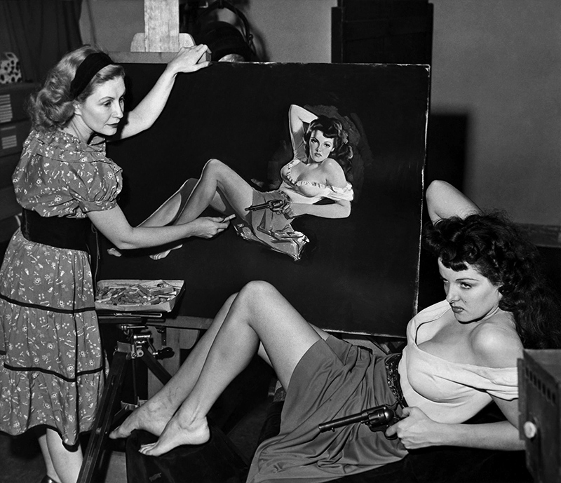 L’actrice américaine Jane Russell pose pour l’illustratrice Zoë Mozert pour l’affiche du film The Outlaw (1943).