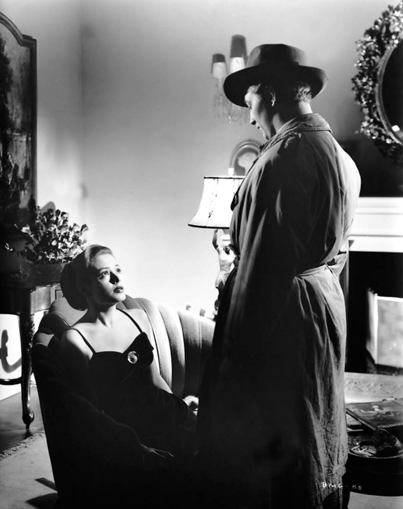 Ces deux visions différentes ont malgré tout un point commun : la femme elle-même. Les films noirs sont pleins de personnages féminins destructeurs, et ceux où l’amour enracine les meilleurs aspects du héros, et non les pires, sont rares : They Live by Night (Les Amants de la nuit, Nicholas ray, 1948), par exemple. Dans les autres, Criss Cross, Angel Face (Un si doux visage, Otto Preminger, 1952), Hell’s Island (Les Iles de l’enfer, Phil Karlson,1955) et Double indemnity (Assurance sur la mort, Billy Wilder, 1944), l’amour des femmes mène à la mort. Pitfall (Andre DeToth, 1948), Nightfall (Poursuites dans la nuit, Jacques Tourneur, 1957), The Big sleep (Le Grand sommeil, Howard Hawks, 1946) et Chinatown (Roman Polanski, 1974), évoquent, eux, un autre aspect du même thème. Le héros s’attend à être trahi mais s’aperçoit plus tard qu’il a tort. Cette méfiance ne peut d’ailleurs être aussi radicalement menaçante, ou destructrice, que les véritables trahisons, telles qu’on les trouve dans Out of the past car la vision noire s’accommode moins facilement d’une erreur d’appréciation du héros que de sa fatale obsession. [Encyclopédie du film Noir – Alain Silver et Elizabeth Ward – Ed Rivages (1979)]