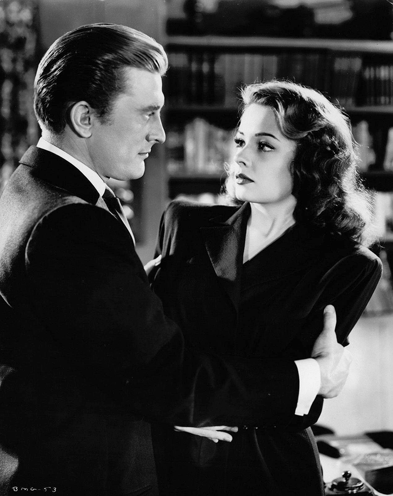OUT OF THE PAST (Jacques Tourneur, 1947). Les acteurs furent au rendez-vous. Kirk Douglas, avec son jeu excessif, n’est jamais aussi convaincant qu’en méchant teigneux de film noir : le personnage de Whit Sterling lui convient à merveille. Il incarne parfaitement cet homme reptilien, trop riche, trop jeune et trop impitoyable, et chacune de ses apparitions est électrisante. Le regard éclatant et rusé de Jane Greer trahit une vénalité absente de son visage espiègle, un peu rond. Ses talents d’allumeuse lui offrent une place de choix dans les rangs des Circé cinématographiques, où elle reste inégalée (Greer s’entendait d’ailleurs très bien avec deux des filles chéries de Dark City : Gloria Grahame et Audrey Totter. Imaginez les soirées que ça pouvait donner !).