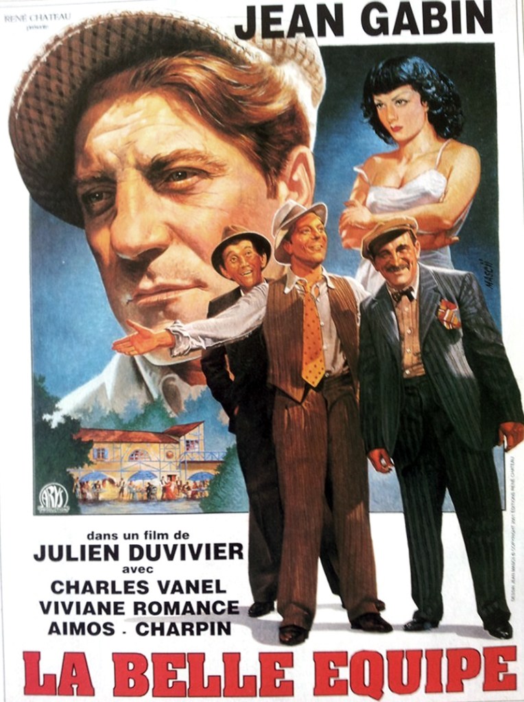C’est vraisemblablement à l’automne 1935 que l’idée du film est née dans l’esprit de Charles Spaak à qui Duvivier, parti à Prague tourner Le Golem, a demandé de réfléchir à un sujet original. Petit à petit, se développe l’histoire d’un groupe de copains qui, gagnant à la Loterie Nationale, s’associent pour ouvrir une guinguette. A la même époque, Spaak travaille déjà, avec Jean Renoir, à ce qui deviendra, en 1937, La Grande illusion et l’on a souvent dit que Renoir aurait souhaité échanger ce sujet contre celui de La Belle équipe. (…) Le scénario de la future Belle équipe a pour titre « Jour de Pâques », allusion au jour d’ouverture de la guinguette. Très tôt, le choix des deux acteurs principaux est fixé : dès février 1936, Jean Gabin et Charles Vanel sont annoncés dans la presse. Ils gardent d’ailleurs leurs propres prénoms dans le film. Pour le premier rôle féminin – Gina, épouse de Charles – il aurait été question, paraît-il, d’engager Edwige Feuillère ou… Marlene Dietrich ! Ce projet, s’il a été réellement conçu, n’a guère dû sortir du domaine de l’utopie… Duvivier, ayant donné un petit rôle à Viviane Romance dans La Bandera, lui avait promis de lui en confier un plus important à l’avenir. Celle-ci se rappelle alors à son bon souvenir et obtient le rôle, qui sera décisif pour sa carrière. Après Gabin et Vanel, l’équipe de copains est complétée par Charles Dorat, Raymond Aimos et Raphaël Médina. [Julien Duvivier « Le mal aimant du cinéma français » Vol 1 : 1896-1940 – Eric Bonnefille – Edition L’Harmattan – 2002]