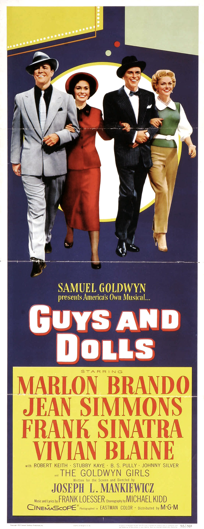 A première vue, l’affiche de Guys and dolls (Blanches Colombes et Vilains Messieurs) a de quoi surprendre. Joseph Mankiewicz, le cinéaste psychologique de A Letter to three wives (Chaînes conjugales) et de The Barefoot contessa (La Comtesse aux pieds nus), dirigeant le « sauvage » Brando dans une comédie musicale ? Sans doute fallait-il l’audace – d’aucuns diront l’inconscience – du producteur Samuel Goldwyn pour s’y risquer. Certes, la présence dans le film de Jean Simmons et, surtout, du crooner Frank Sinatra, a de quoi rassurer les fans du genre – Vivian Blaine étant là quant à elle pour apporter au projet la caution de Broadway. Bien sûr, Joseph Mankiewicz ne se contentera pas de l’intrigue maigrelette du spectacle original : il apportera au scénario son goût des rapports humains complexes et inattendus. Le film s’en trouvera rallongé d’autant. Mais le réalisateur n’en respecte pas moins la commande. Épaulé par le chorégraphe Michael Kidd, qui signe ici les numéros musicaux, Mankiewicz prouve, quelques années avant de se lancer dans Cléopâtre, qu’il n’est pas seulement un cinéaste cérébral. Certains critiques feront la fine bouche devant le résultat, mais le public suivra, faisant de Guys and dolls un grand succès commercial.