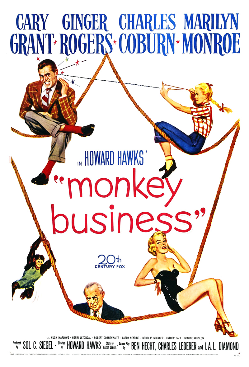 Mais au cours de ces années 1930, le cinéma hollywoodien est également dominé par un couple mythique, Fred Astaire et Ginger Rogers, qui portent la comédie musicale à son zénith. Et c’est aussi l’époque où un jeune premier du nom de Cary Grant se met à faire tourner la tête des plus belles vedettes… Nul doute qu’en se voyant offrir un véritable rôle face à Cary Grant et Ginger Rogers, héros de son enfance, la jeune Marilyn a réalisé avec Monkey Business l’un de ses plus beaux rêves.