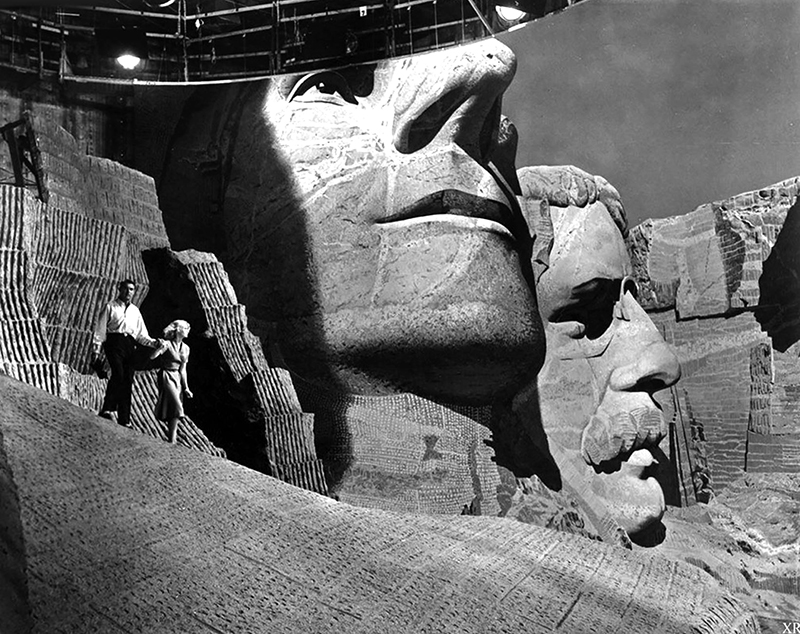 NORTH BY NORTHWEST (La Mort aux trousses) – AlfrNORTH BY NORTHWEST (La Mort aux trousses) – Alfred Hitchcock (1959) – Cary Grant, EvComme l’administration du parc national pensait que tourner des scènes violentes profanerait ce « sanctuaire de la démocratie », les têtes sculptées du mont Rushmore furent elles aussi entièrement reconstituées en studio.