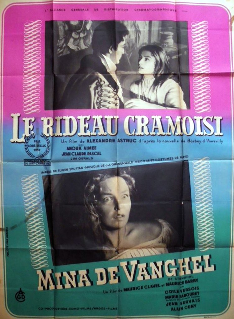 En 1953, sous le titre Les Crimes de l’amour, furent présentés deux moyens métrages, inspirés respectivement de Stendhal et Barbey d’Aurevilly : Mina de Vanghel, de Maurice Clavel (et Maurice Barry) et Le Rideau cramoisi d’Alexandre Astruc. On parla peu du premier, unique incursion du célèbre écrivain dans la mise en scène, et c’est dommage, car il était excellent; on peut même dire que c est la seule interprétation satisfaisante de Stendhal, qui ait jamais été réalisée, et de plus Odile Versois y trouva un de ses meilleurs rôles. Mais tout le succès alla au second et à son auteur, déjà connu comme journaliste, critique et théoricien de la nouvelle avant-garde, dont la pensée et les écrits se trouvent directement à l’origine (avec ceux d’André Bazin) de la nouvelle vague.