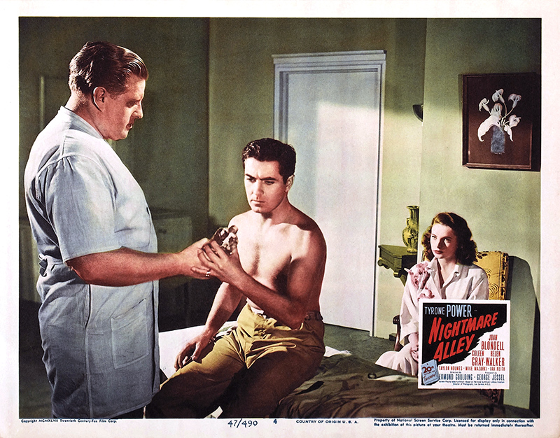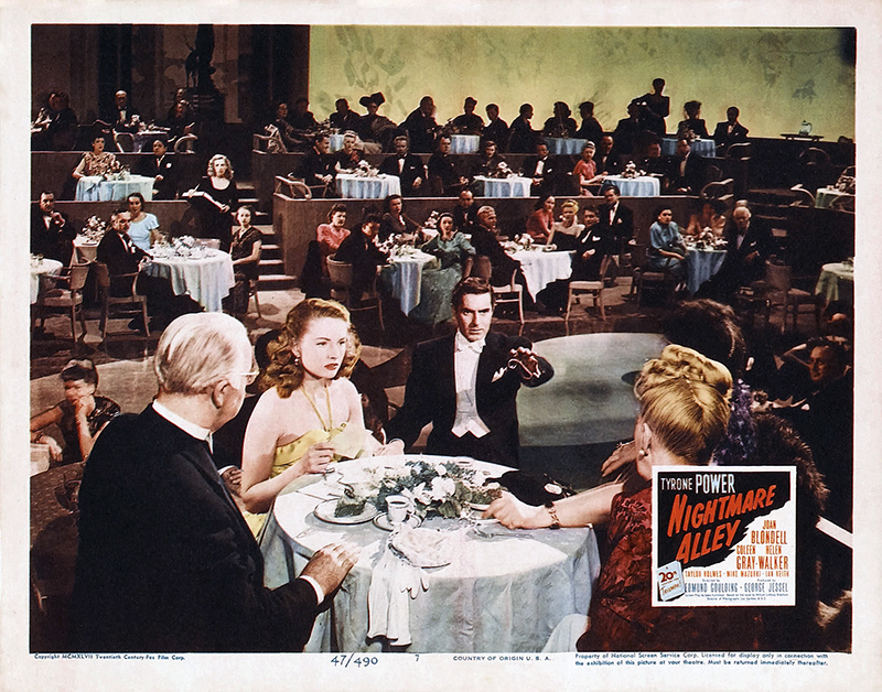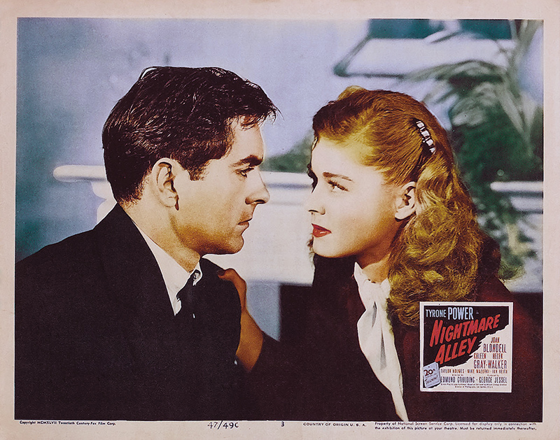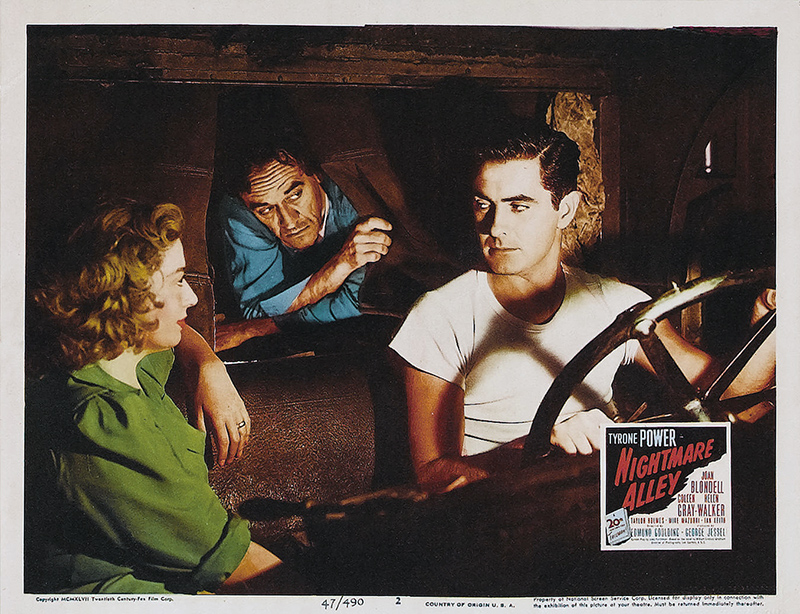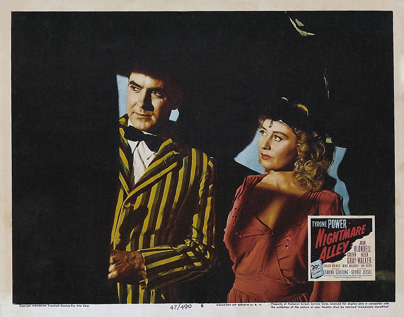Nightmare Alley est une adaptation faite par Jules Furthman du roman de William Lindsay Gresham qui fut toujours fasciné par la face sombre de l’univers du divertissement. Il écrivit beaucoup sur les foires et les cirques et finit par se suicider. Le film est un tableau des foires itinérantes, « les bas-fonds » du show-business en quelque sorte. La peinture de ce milieu et la photographie aux éclairages sombres de Lee Garmes relèvent d’une esthétique expressionniste. Passant des coulisses misérables de la fête foraine aux salles luxueuses des boîtes de nuit élégantes, Stan est un homme piégé par un destin pervers. On soupçonne sa future déchéance dès le début du film lorsqu’il exprime son horreur pour le « geek », le monstre avaleur de poulets, qui est à l’échelon le plus bas de la hiérarchie foraine. Le rôle du « Grand Stanton », parfaite canaille qui en fait trop, était un véritable contre emploi pour Tyrone Power qu’on était habitué à voir dans des rôles de romantiques, approchant presque la sainteté dans Le fil du rasoir.