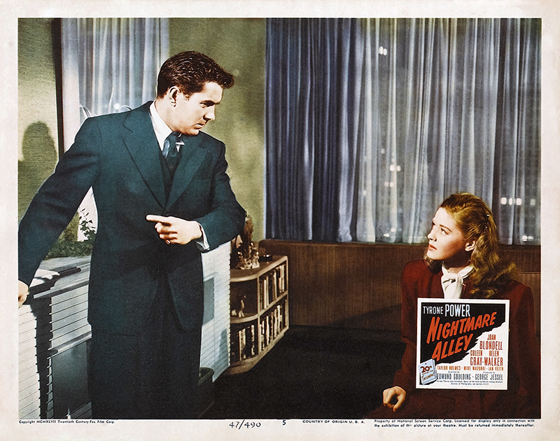 Nightmare alley est une adaptation faite par Jules Furthman du roman de William Lindsay Gresham qui fut toujours fasciné par la face sombre de l’univers du divertissement. Il écrivit beaucoup sur les foires et les cirques et finit par se suicider. Le film est un tableau des foires itinérantes, « les bas-fonds » du show-business en quelque sorte. La peinture de ce milieu et la photographie aux éclairages sombres de Lee Garmes relèvent d’une esthétique expressionniste. Passant des coulisses misérables de la fête foraine aux salles luxueuses des boîtes de nuit élégantes, Stan est un homme piégé par un destin pervers. On soupçonne sa future déchéance dès le début du film lorsqu’il exprime son horreur pour le « geek », le monstre avaleur de poulets, qui est à l’échelon le plus bas de la hiérarchie foraine. Le rôle du « Grand Stanton », parfaite canaille qui en fait trop, était un véritable contre emploi pour Tyrone Power qu’on était habitué à voir dans des rôles de romantiques, approchant presque la sainteté dans Le fil du rasoir.