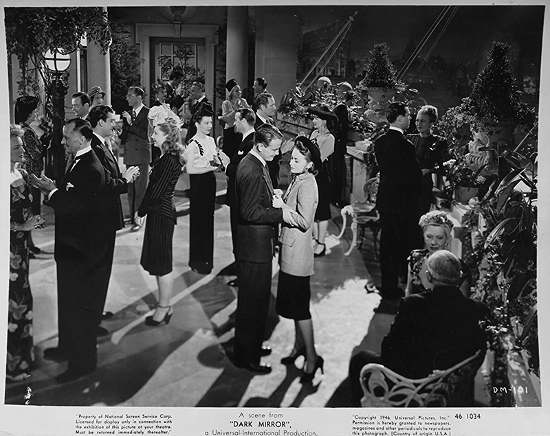Initialement, la trame de The Dark mirror provient d’une nouvelle de l’écrivain français d’origine russe Vladimir Pozner (1905), publiée, dans le magazine californien « Good Housekeeping ». Cet ami de Picasso, de Faulkner, de Brecht, de Lillian Hellman, exilé aux USA pendant la guerre, a débuté comme scénariste en 1944 seulement, après avoir été charpentier sur fer aux Chantiers Navals de San Francisco ! Le thème de son histoire n’est bien sûr pas foncièrement original et rappelle celui de A Stolen life, un mélo tourné par Paul Czinner en 1939 en Angleterre ct refait en mars 1946 par Curtis Bernhardt aux studios Warner, presque en même temps que le film de Siodmak. Le producteur-scénariste d’International Film, Nunnally Johnson (auquel on doit le script de plusieurs classiques de John Ford) rachète le récit de Pozner, en tire une adaptation « pas très bonne » (Siodmak) et s’absente pendant toute la durée du tournage, qui a lieu en mars 1946 dans les studios Goldwyn. [Robert Siodmak (Le maître du film Noir) – Hervé Dumont – Ed. L’Age d’Homme (1981)]