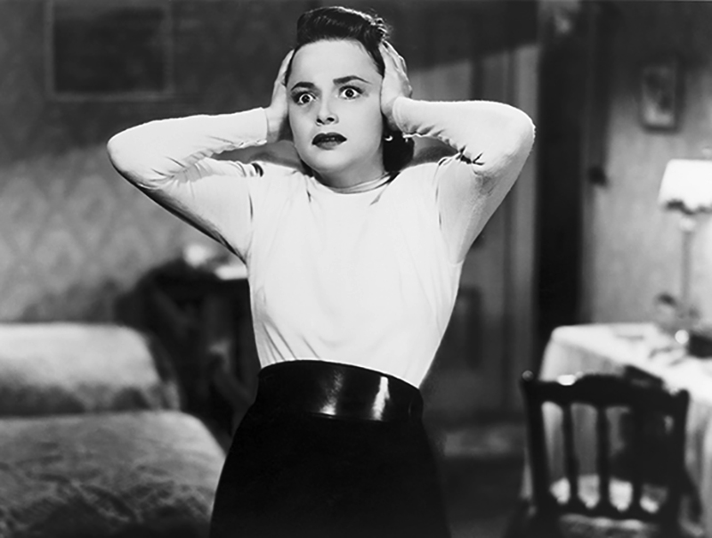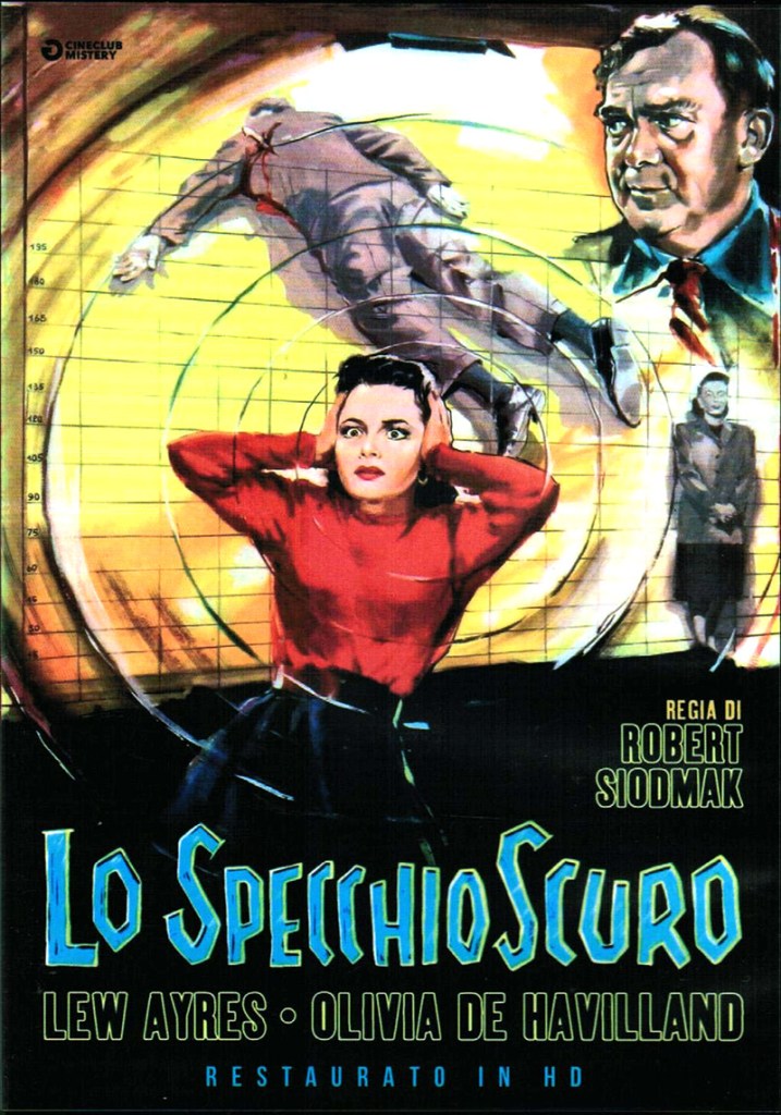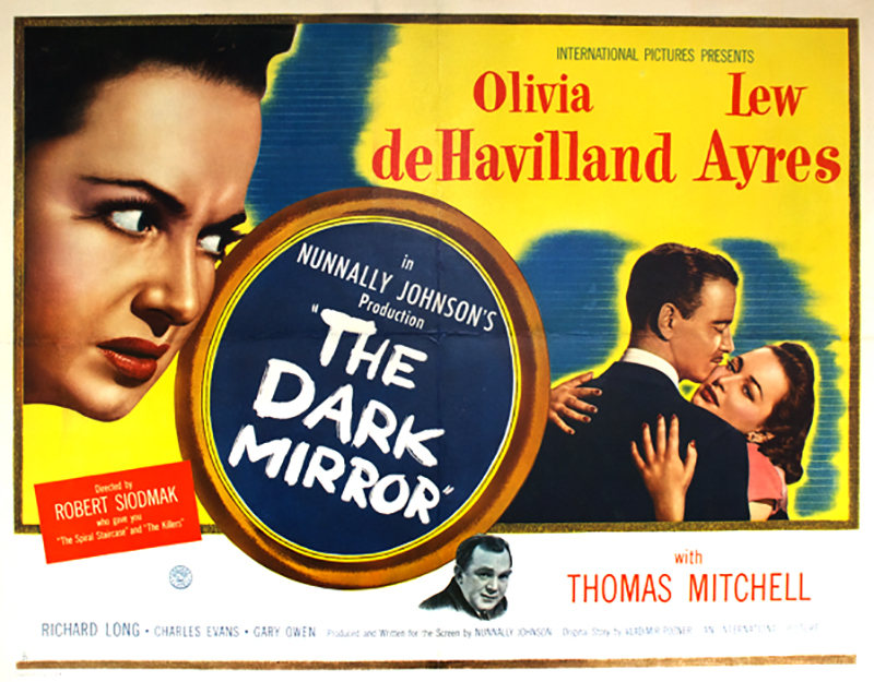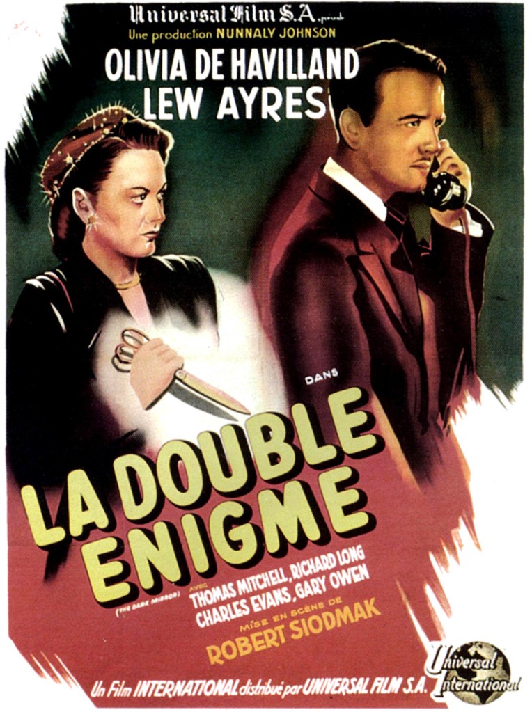 Olivia de Havilland. longtemps la partenaire attitrée d’Errol Flynn, vient de se libérer de son contrat despotique avec Harry Warner et espère mettre ses talents de tragédienne à l’épreuve, Le rôle d’Elliot échoit à la vedette éphémère de All Quiet on the Western Front (A l’ouest rien de nouveau) (1930), Lew Ayres – un objecteur de conscience de 1941 à 1945 qui tente un « come-back » en dépit du boycottage de ses films par les ligues patriotiques. La double exposition, dans The Dark mirror, pose de délicats problèmes techniques car Siodmak ne se contente pas de confronter Olivia à Olivia dans un même plan, mais les « jumelles » s’embrassent et se dorlotent face à la caméra, et si possible devant une glace, ce qui constitue un horrible casse-tête. Le cinéaste remet donc la direction de ces trucages photographiques, impliquant de savants systèmes de caches et de contre-caches, à un ami de longue date, également exilé, Eugen Schüfftan. Celui-ci est cependant forcé de travailler « au noir », l' »American Society of Cinematographers » (A.S.C., le syndicat des opérateurs) ayant refusé sa candidature. [Robert Siodmak (Le maître du film Noir) – Hervé Dumont – Ed. L’Age d’Homme (1981)]