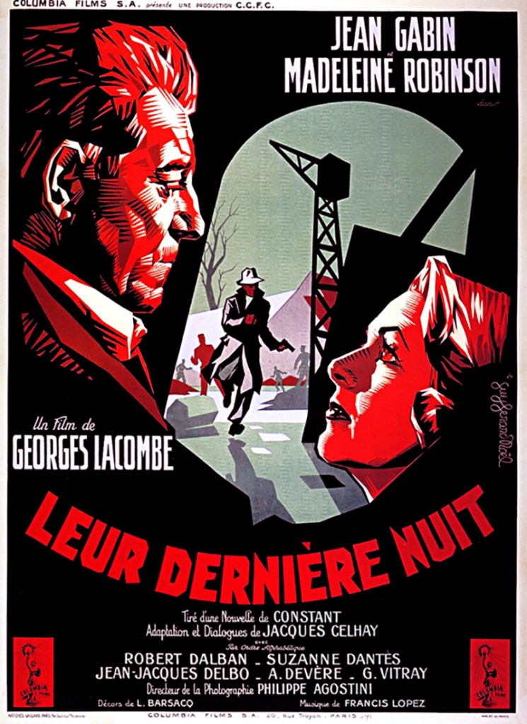 De son côté, Gabin s’avère d’autant plus désireux de jouer dans Leur dernière nuit que Constant lui a déjà porté chance en signant, en 1937, le scénario de Pépé le Moko. L’amitié liant Gabin et Lacombe amène en outre le comédien à prendre une part active au casting du film. Pour incarner la mystérieuse Madeleine, leur choix se porte bientôt sur Madeleine Robinson, comédienne en vogue qui s’est vue décerner récemment une Victoire du cinéma français (l’ancêtre des Césars). Mais Gabin l’apprécie surtout pour avoir joué avec elle dans la pièce d’Henri Bernstein, La Soif : durant toute une année, il a pu mesurer sur scène l’étendue du talent de la jeune femme. Pour interpréter l’inspecteur Dupré, qui va harceler le personnage de Madeleine, Lacombe fait appel à Robert Dalban qui se trouve être à la fois un ami de Gabin, et l’ex-mari de Madeleine Robinson. Sans doute pour faire bonne mesure, le rôle de la prostituée qui surnomme ses clients « mon lapin » sera offert à Gaby Basset, qui n’est autre que la première femme de Gabin… [Collection Gabin – Eric Quéméré – mars 2006]