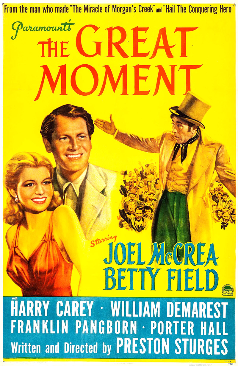 Réalisé en 1943 – mais distribué seulement en 1944 – The Great Moment retrace la vie du dentiste américain William Morton, qui expérimenta au XIXe siècle les premiers anesthésiques. Un sujet édifiant que Sturges agrémente de gags burlesques. Tout comme dans The Great McGinty , il dément cyniquement l’adage moral qui veut que la vertu soit récompensée. En renonçant noblement aux profits de sa découverte pour soulager son prochain, le héros signe sa propre ruine. Ce sera aussi le premier échec commercial de Sturges…