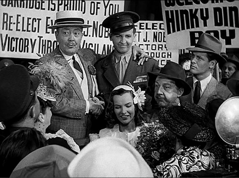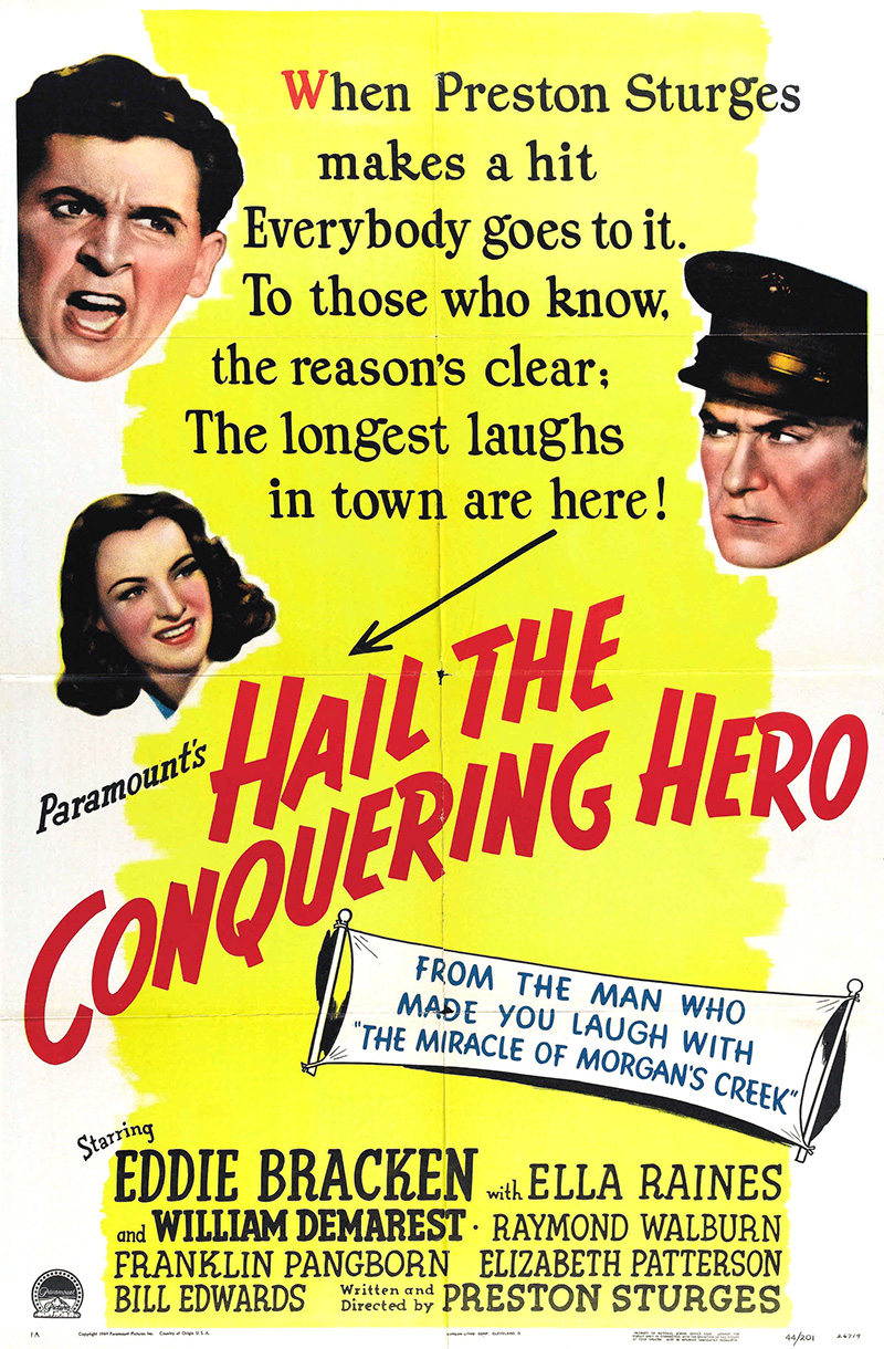 Deux nominations aux Oscars vont consacrer le talent de scénariste de Sturges: pour The Miracle of Morgan’s Creek (Miracle au village, 1943) et pour Hail the Conquering Hero (Héros d’occasion, 1944), qui ont tous deux pour vedette Eddie Bracken. Au mépris du Code Hays, The Miracle of Morgan’s Creek met en scène une jeune fille mettant au monde des quintuplés à la suite d’un mariage inopiné (et sans valeur légale) contracté au terme d’une folle nuit de fête. Après bien des quiproquos, l’idiot du village se verra attribuer cette quintuple paternité qui lui gagnera enfin la considération de ses concitoyens. Le film aura d’ailleurs des démêlés avec la censure et sa sortie sera retardée. Dans Hail the Conquering Hero, Eddie Bracken, réformé pour cause de rhume des foins, se fera passer aux yeux de sa mère, au prix d’incroyables stratagèmes, pour un héros, afin de satisfaire aux traditions patriotiques familiales.