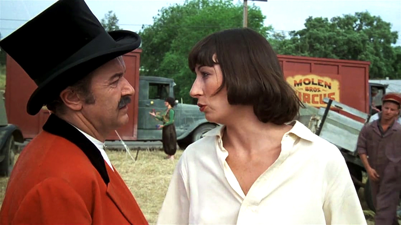 Angelica Huston joue le rôle de l’autre femme, dompteuse comme dans le roman, mais la séquence de leur escapade est traitée sur un mode presque comique. Ici, encore elle déclenchera la jalousie de Cora, alors enceinte de Frank. Mais finalement le mariage aura bien lieu et constitue l’éphémère mais émouvant constat d’un amour absolu. Cette scène correspond par bien des côtés au moment où dans le livre les deux amants nagent vers le large pour se prouver leur amour. [Regards sur les 5 adaptations cinématographiques – Gérard Camy – L’Avant-Scène Cinéma (Le Facteur sonne toujours deux fois) – avril 2004]