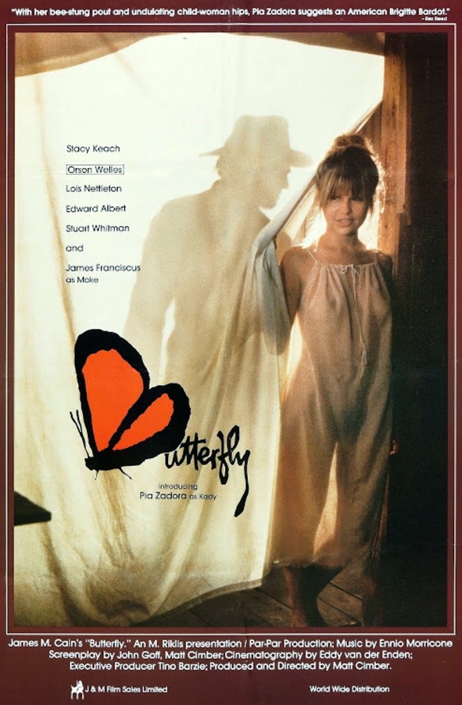 Butterfly est très fidèle au roman de Cain. Sans doute Matt Cinder rend-il sa jeune actrice, Pia Zadora, un peu plus exhibitionniste que ne l’exigeait vraiment le rôIe, mais les motivations des divers personnages sont exposées avec clarté, sans hypocrisie. La communauté d’une petite ville isolée dans une nature aride et sauvage, avec son esprit retors et ses sentiments simples voire primitifs, est dépeinte avec sensibilité, et l’obsession – de Stacy Keach reste omniprésente dans les méandres de l’histoire. La fin reste ouverte en annonçant celle prévue par Cain (la voiture de Stacy Keach s’éloigne ; une voiture déboîte et la suit). A souligner aussi la composition truculente d’Orson Welles dans le rôle du juge.