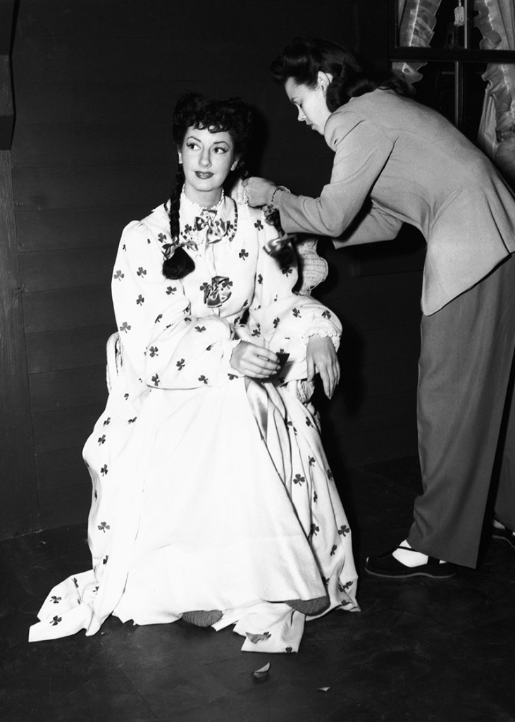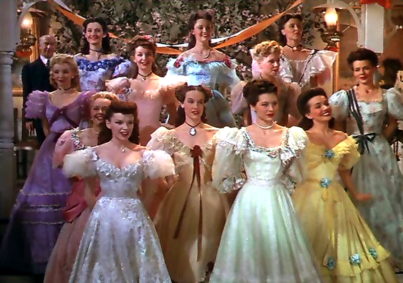 Les véritables pionniers de l’Ouest américain auraient sans doute été amusés de découvrir la manière dont la MGM a dépeint leur univers dans The Harvey Girls (les Demoiselles Harvey). Revu par le flamboyant directeur artistique Cedric Gibbons, le Far West est ici un décor aux couleurs d’autant plus pimpantes qu’elle sont accentuées par le Technicolor. Et le décalage est encore souligné par le fait que les personnages chantent à qui mieux mieux, qu’ils soient tristes ou gais. Mais c’est justement de cette artificialité que la comédie musicale en général, et celle-ci en particulier, tire son pouvoir. L’histoire rude et souvent violente des colons de l’Ouest – une histoire qui, pour les spectateurs de 1946, n’est révolue que depuis deux ou trois générations – se mue par la grâce du cinéma en une épopée joyeuse et simple, pour laquelle on peut éprouver une nostalgie de bon aloi… Judy Garland était donc l’héroïne rêvée pour un tel film, avec ses yeux de biche et sa détermination à toute épreuve. Comme dans Meet me in St. Louis (Le Chant du Missouri) et Easter parade (Parade de Printemps), la star revisite avec The Harvey Girls un épisode mythique de l’histoire des États-Unis, ce qui augmentera encore l’affection qu’éprouve pour elle une grande partie du public américain.