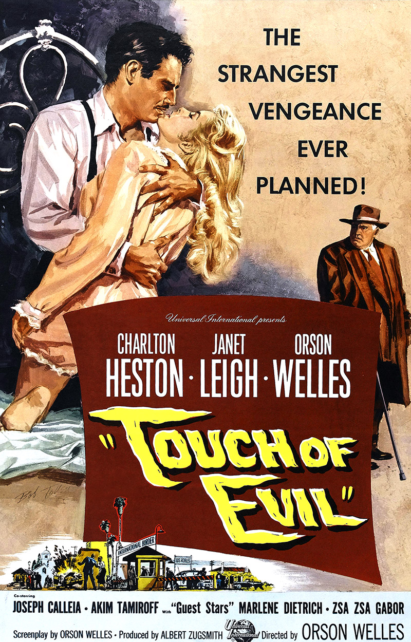 Welles s’est surpassé pour démontrer qu’il demeurait un artiste crédible, capable d ‘attirer le public. Après des années de fumisteries autodestructrices et quelques bégaiements créatifs, ce modeste thriller de série B permit au génie de faire son retour dans le cinéma. Voilà un homme dont le premier film, Citizen Kane, changea pour toujours la grammaire cinématographique, et qui offre au film noir sa syntaxe : la ténébreuse quête de vérité sur des terres où l’ambiguïté morale fait loi, l’acceptation cynique de la corruption par le pouvoir, le style visuel anti-conventionnel et avant-gardiste. Avec Touch of evil, le plus influent des réalisateurs contemporains se retrouvait à travailler pour le producteur Albert Zugsmith, qui allait enchaîner sur des chefs-d’œuvre tels que Sex kittens go to college et The Incredible sex Revolution.