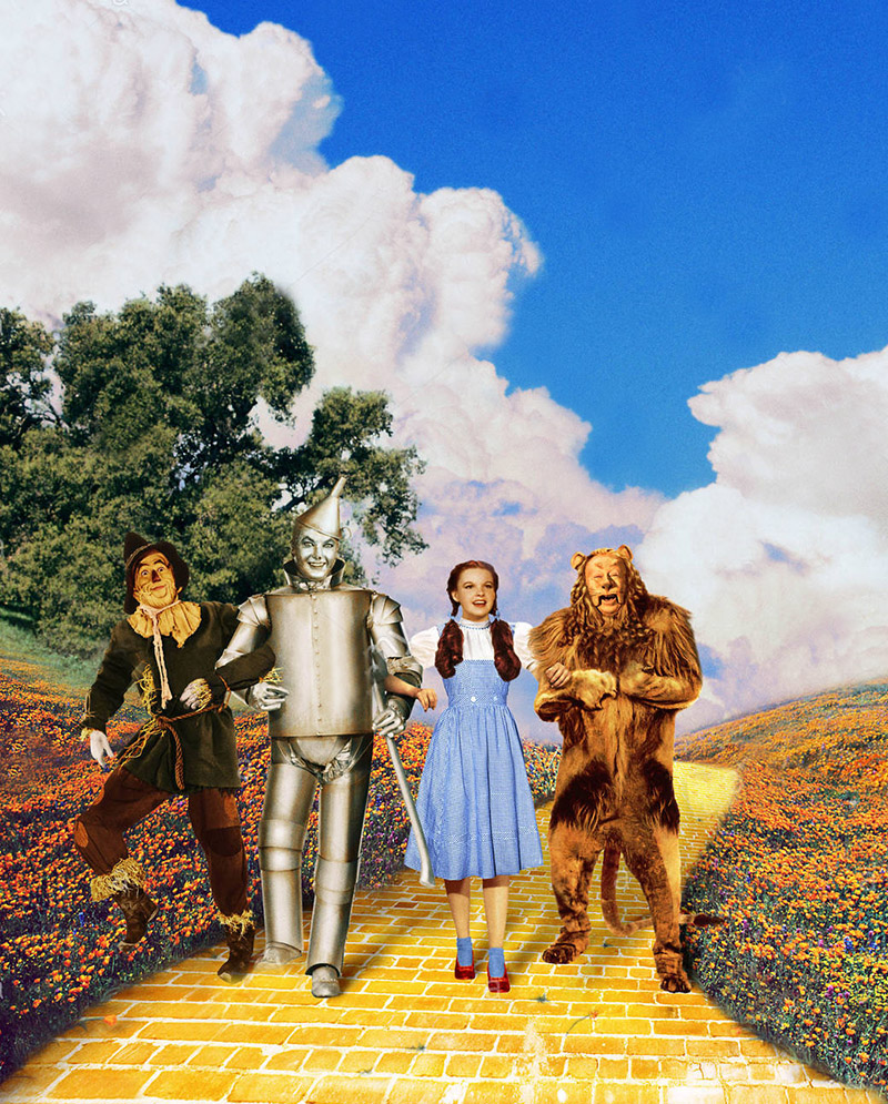 Elle doit le retrouver et suivre pour cela la route payée de briques jaunes, Elle part donc pour la Cité d’émeraude et, en chemin, rencontre successivement l’épouvantail, l’homme en fer-blanc et le lion peureux. Ceux-ci accompagnent Dorothy, espérant que le magicien d’Oz sera capable d’exaucer leurs vœux, de donner une cervelle à l’épouvantail, un cœur à l’homme en fer-blanc et du courage au lion peureux. Ils arrivent finalement tous en vue de la Cité d’émeraude mais la vilaine sorcière de l’Ouest est décidée à les en empêcher. Glinda leur évite d’être empoisonnés par des fleurs maléfiques et les quatre amis atteignent enfin le château du magicien. Mais Dorothy et Toto sont enlevés par les singes ailés de la vilaine sorcière. L’épouvantail, l’homme en fer-blanc et le lion peureux se portent au secours de Dorothy qui finit par disparaître, victime de l’eau qu’elle a reçue. Le magicien se révèle n’être qu’un charlatan mais, grâce à lui, chacun trouve une partie de ce qu’il cherchait. Dorothy peut repartir chez elle, comme elle le souhaite. C’est alors que Dorothy se réveille. Ce n’était qu’un rêve. Elle est bien au Kansas, chez elle, auprès des siens et de ceux qu’elle connaît.