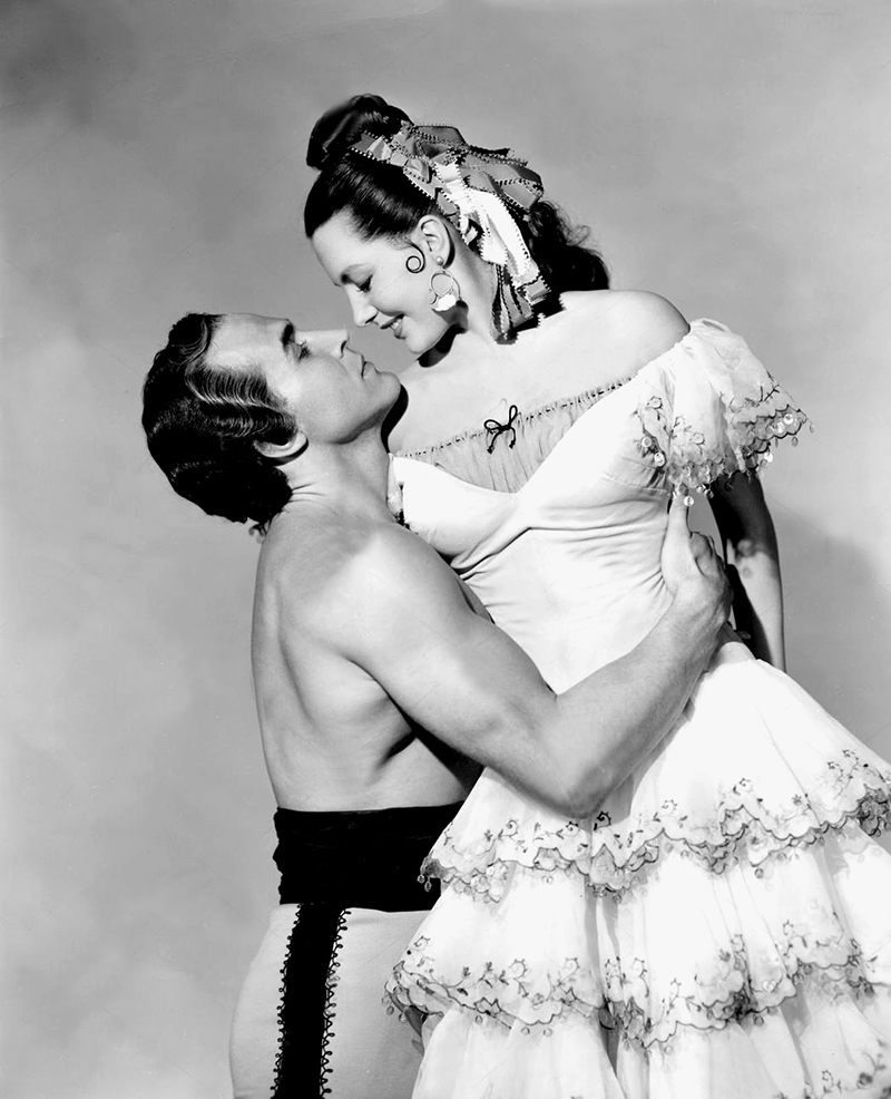 En 1947, dans Fiesta (Señorita toréador) de Richard Thorpe, le Mexicain Ricardo Montalban partage le haut de l’affiche avec Esther Williams, mais c’est avec Cyd Charisse qu’il danse un fandango et inaugure une série de quatre films où ils réaliseront ensemble quelques-uns des plus beaux numéros de l’histoire de la comédie musicale. On an Island with You (Dans une Île avec vous, 1948), également de Richard Thorpe, donne à Cyd Charisse l’occasion d’exécuter avec Montalban une magnifique scène de ballet sur une musique contemporaine avec le beau Mexicain Ricardo Montalban. Elle le retrouve dans The Kissing Bandit (Le Brigand amoureux, 1948) de László Benedek, où ils sont rejoints, pour une « danse de la jalousie » endiablée et colorée, par une autre ballerine de genre, Ann Miller. Cyd Charisse occupe pour la première fois le haut de l’affiche en 1951, dans Mark of the Renegades (Le Signe des renégats) de Hugo Fregonese, qui se déroule au début du XIXe siècle au Mexique. Elle y séduit un agent secret incarné par Ricardo Montalban. Elle danse en solo devant lui un somptueux flamenco, puis il la rejoint pour un duo torride ! Elle retrouvera Montalban en 1953 pour Sombrero de Norman Foster, mais ils ne dansent pas ensemble et le grand moment du film est un numéro en solo où Cyd Charisse, dans une sensuelle robe noire fendue, exécute une danse de Bohémienne dans les ruines d’un temple aztèque… [Cyd Charisse, danseuse fatale -Hollywood, la cité des femmes – Antoine Sire (Ed. Institut Lumière / Actes Sud, 2016)]