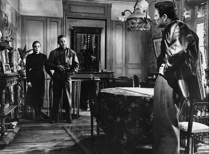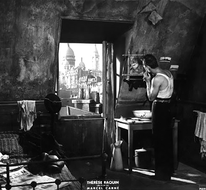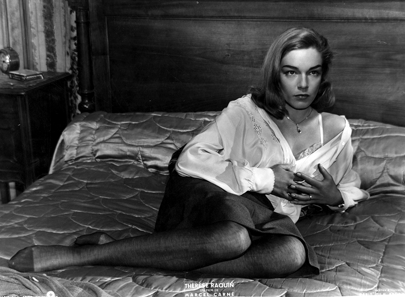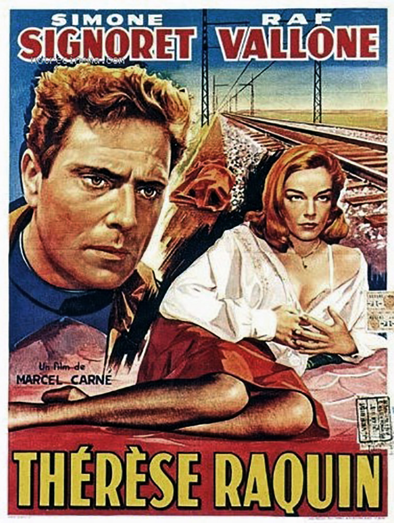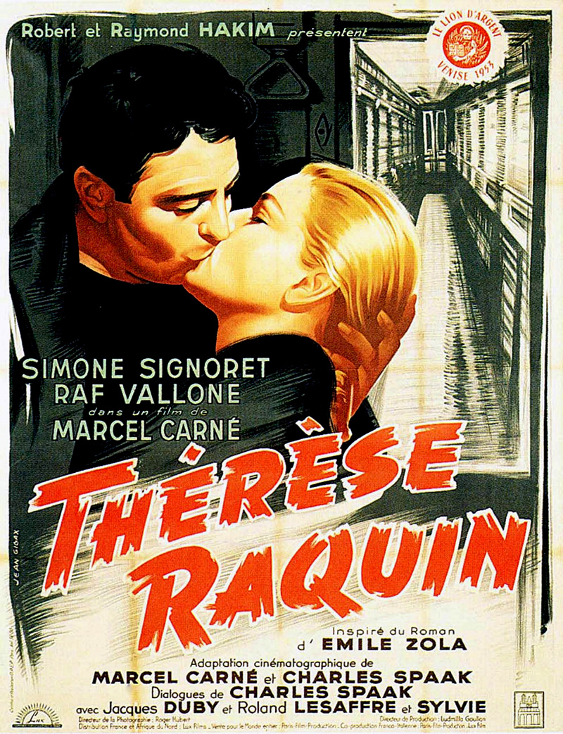 Thérèse sert d’infirmière à un mari hargneux, Camille (Jacques Duby), lui-même esclave consentant de sa vieille mère (Sylvie), un monstre femelle qui poursuit sa bru d’une haine inextinguible qui fermente dans le huis clos de la petite-bourgeoisie provinciale. Hantée par sa passion pour Laurent (Raf Vallone), elle refuse pourtant de s’enfuir avec lui. Laurent devient alors un familier de la petite société qui se réunit autour de Camille et de sa mère pour jouer aux « chevaux » dans un salon sinistre dont on perçoit presque les odeurs de naphtaline et d’encaustique. Mais Camille emmène Thérèse à Paris, pour la mettre sous bonne garde. Apprenant leur départ, Laurent se faufile dans le train. Thérèse, croyant son mari endormi dans le compartiment, sort pour le rejoindre. Camille la suit et, après une violente dispute avec Laurent, il est précipité par la portière ouverte. Personne n’a vu Laurent monter dans le train. A la police, Thérèse affirme avoir dormi pendant tout le voyage, elle n’a pas vu son mari sortir. Elle retourne chez elle, et affronte tranquillement le regard haineux de sa belle-mère, qui a tout compris mais ne peut plus parler. Foudroyée par une attaque, elle est paraplégique. La comédienne Sylvie est inoubliable dans ces moments, avec son regard de sorcière vaincue, éternellement fixe, où se reflètent les flammes de la cheminée et toute la haine enfin justifiée mais impuissante d’une harpie de province qui a perdu son fils, son unique raison de vivre, et qui voit triompher sa rivale. Le crime serait parfait s’il n’y avait eu un témoin dans le compartiment. C’est Roland Lesaffre, baroudeur de charme et maître chanteur d’occasion, le personnage inventé par Carné pour remplacer le fantôme imaginé par Zola. Laurent et Thérèse cèdent à ses exigences et lui donnent de l’argent. Ils sont libres de s’enfuir. Mais le maître chanteur se fait écraser par un camion fou qui déboule dans la rue. Il ne rentrera pas à son hôtel à temps pour empêcher la femme de chambre de poster sa lettre de dénonciation. [Marcel Carné « Le môme du cinéma français » – David Chanteranne – Ed. Soteca (2012)]