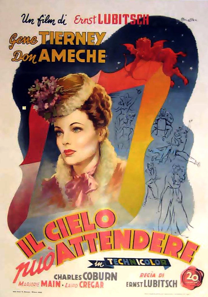 Henry Van Cleve vient de mourir, une infirmière au visage d’ange à son chevet. Son existence fut dévolue au plaisir : il se présente donc spontanément devant le diable. Mais on n’obtient pas sa place en enfer aussi facilement. Pour que Lucifer puisse juger, Henry lui raconte sa vie, dont la plus grande qualité fut, sans conteste, sa merveilleuse épouse, Martha. A travers ce portrait d’un Casanova infantile et attachant, Lubitsch brode une apologie de la félicité conjugale. Il traite de l’amour, du deuil, de la trahison, du plaisir et de la mort avec la pudeur de ceux qui connaissent la fragilité du bonheur. Cette comédie où le cynisme côtoie la pureté et où la mélancolie flirte avec la légèreté gamine est riche en enseignements lubitschiens : il faut beaucoup de scarabées pour séduire les filles, ne jamais laisser passer une femme qui éternue, toujours avoir un grand-père indigne chez soi, et, surtout, faire confiance à l’amour et à la beauté en Technicolor de Gene Tierney. Heaven can wait n’est pas du champagne : c’est un alcool doux et profond. Avec ce film testament, Lubitsch gagna à coup sûr son billet pour le paradis. [Guillemette Odicino – Télérama]