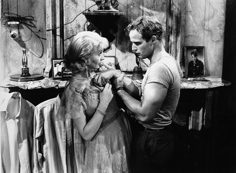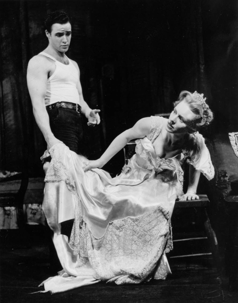 A gauche, la version théâtrale (avec Marlon Brando dans le rôle de Stanley Kowalski et Jessica Tandy dans celui de Blanche Dubois) et la version cinématographique (avec Brando et Vivien Leigh) de la pièce de Tennessee Williams, Un tramway nommé désir. Ces deux mises en scène étaient signées Elia Kazan.