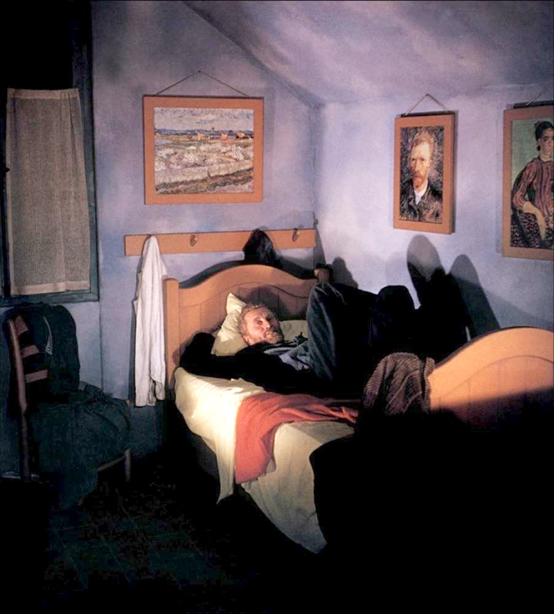 J’entrevis une solution : lorsque Van Gogh pénètre dans la maison, il y a un gros plan sur une lampe. Elle diffuse une lumière très proche des tons de Van Gogh, que nous pouvions, sans trop d’artifices, restituer. Van Gogh passe par différents stades : il se contemple dans le miroir et exècre l’image que celui-ci lui renvoie. Son visage se raidit. Il fait un pas en avant ; on aperçoit dans le miroir le reflet de la lampe ; il n’y a aucun bruit… Soudain, Van Gogh hurle de douleur. La scène est entrevue à travers le miroir : Van Gogh chancelle, sa main ensanglantée lui couvrant l’oreille… Kirk trouvait la solution ingénieuse. Lui-même fut prodigieux au cours de cette scène difficile. » [Tous en scène – Vincente Minnelli (1985)]