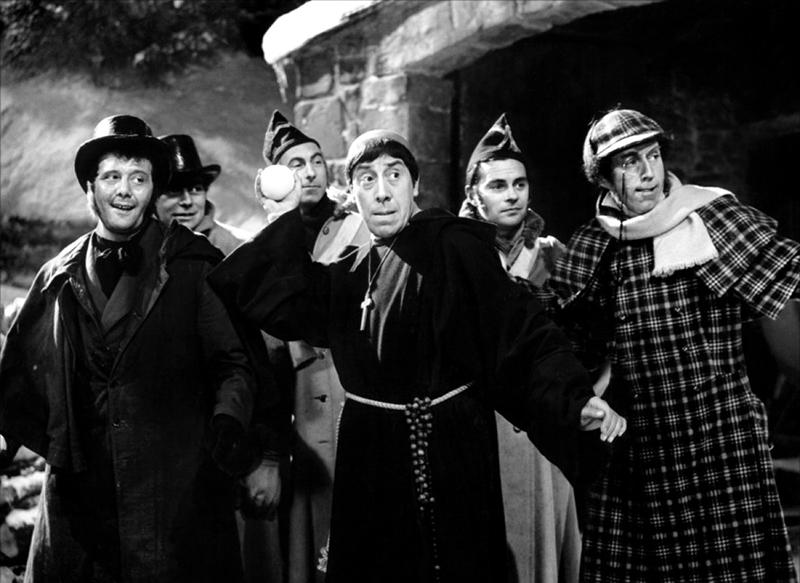 Ces fluctuations théologiques, aboutissant à des manipulations démagogiques de principes abstraits en vue d’imposer avec intolérance une pratique hypothétiquement salutaire ou sanctificatrice, allumèrent les bûchers de l’Inquisition et fondèrent les goulags ; elles constituent dans L’Auberge rouge une satire anticléricale que le burlesque verbal rend virulente alors qu’en général, dans les comédies à la française, la grosse moquerie contribue seulement à renforcer l’importance des curés tout en prétendant la brocarder. Loin d’atténuer l’aspect blasphématoire de cette raillerie, la présence de Fernandel au premier abord, le détourne en direction de la gaudriole ; ensuite, elle en recentre les rebondissements drolatiques sur le sérieux qui forme le noyau dur de n’importe quelle farce authentiquement pulpeuse, destinée à la purge des sociétés constipées, bloquées par des valeurs creuses, rabougries, réactionnaires. Martin, déçu de Marie, tire la triste moralité de la fable : « Voilà ou mène la religion ! » Il a vainement défendu son bonhomme de neige ; encouragés par le moine, les voyageurs se sont amusés à le bombarder avec des boules de neige. Le cadavre a surgi : le meurtre du musicien va mettre en marche la machine policière, la machine judiciaire.