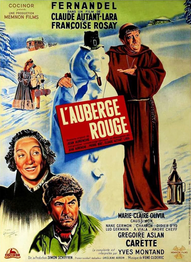 L’Auberge rouge, dit Max Douy (Positif n° 244-45), ça a été un gros morceau ; on a eu deux mois de préparation avec Bac, le chef-opérateur, et Natteau, et c’était épatant. Il y avait 606 numéros dans le découpage, sans compter les A et les B, c’est-à-dire les plans plus rapprochés, et là-dessus il n’y en avait que 17 en extérieurs, c’est-à-dire que presque tout a été fait en studio. Ce qui a été fait en extérieurs au Mont Revard, ce sont les plans de la diligence qui verse en cassant le timon, et les chevaux vus de loin avec le singe entre les deux gendarmes. Ils ont mis quinze jours pour tourner ces dix-sept plans, et tout le reste a été fait en sept semaines et demie à Boulogne, tout en studio, même le petit pont et le générique. » [Claude Autant-Lara – Freddy Buache – Collection « cinéma vivant » – Ed. L’Age d’homme (1982)]